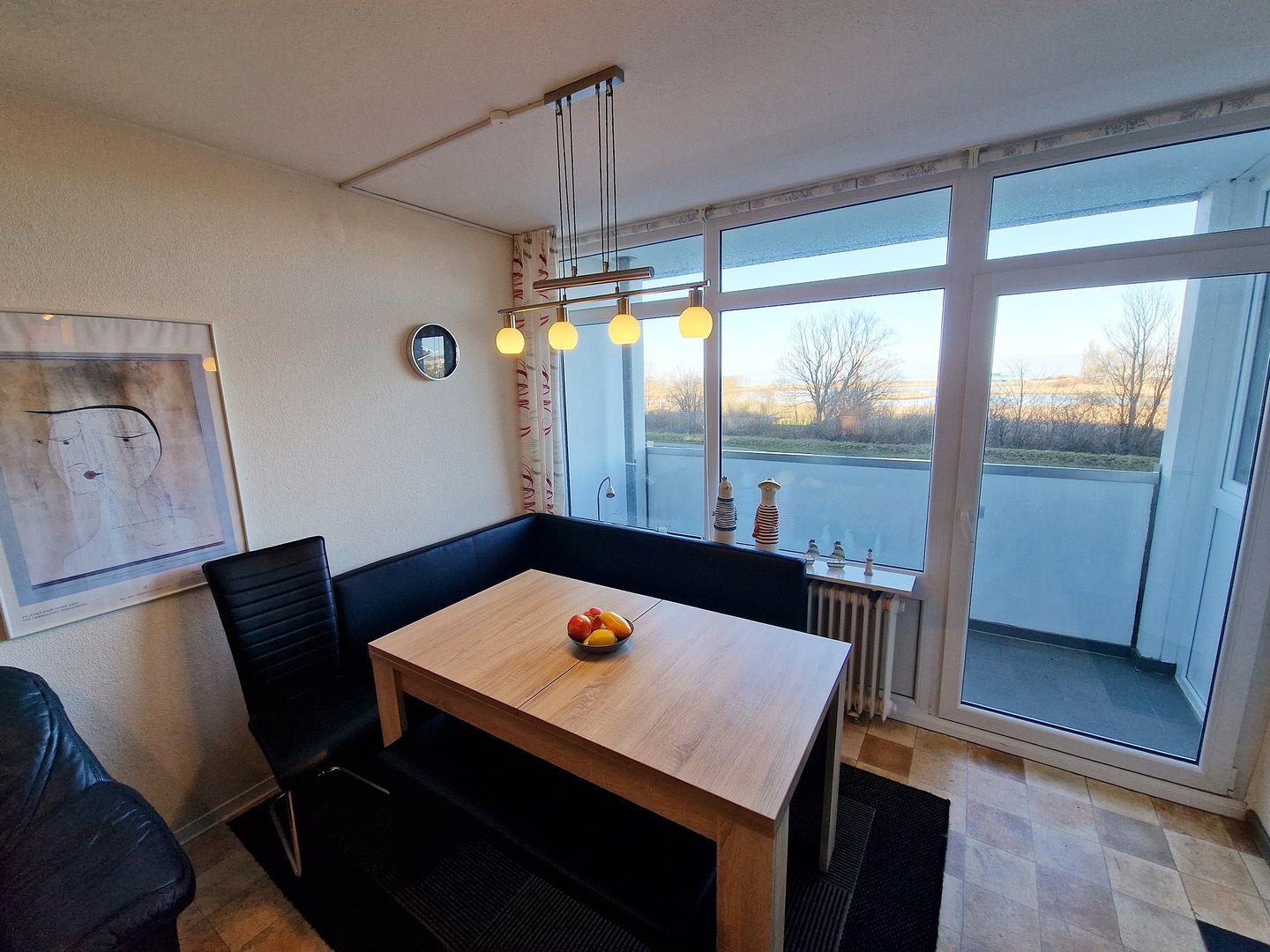 Die Essecke mit Eckbank und Ausziehtisch befindet sich am Fenster.
