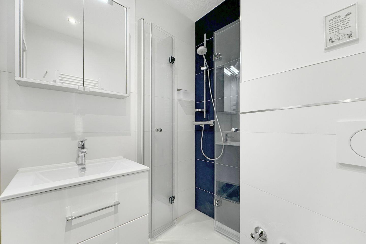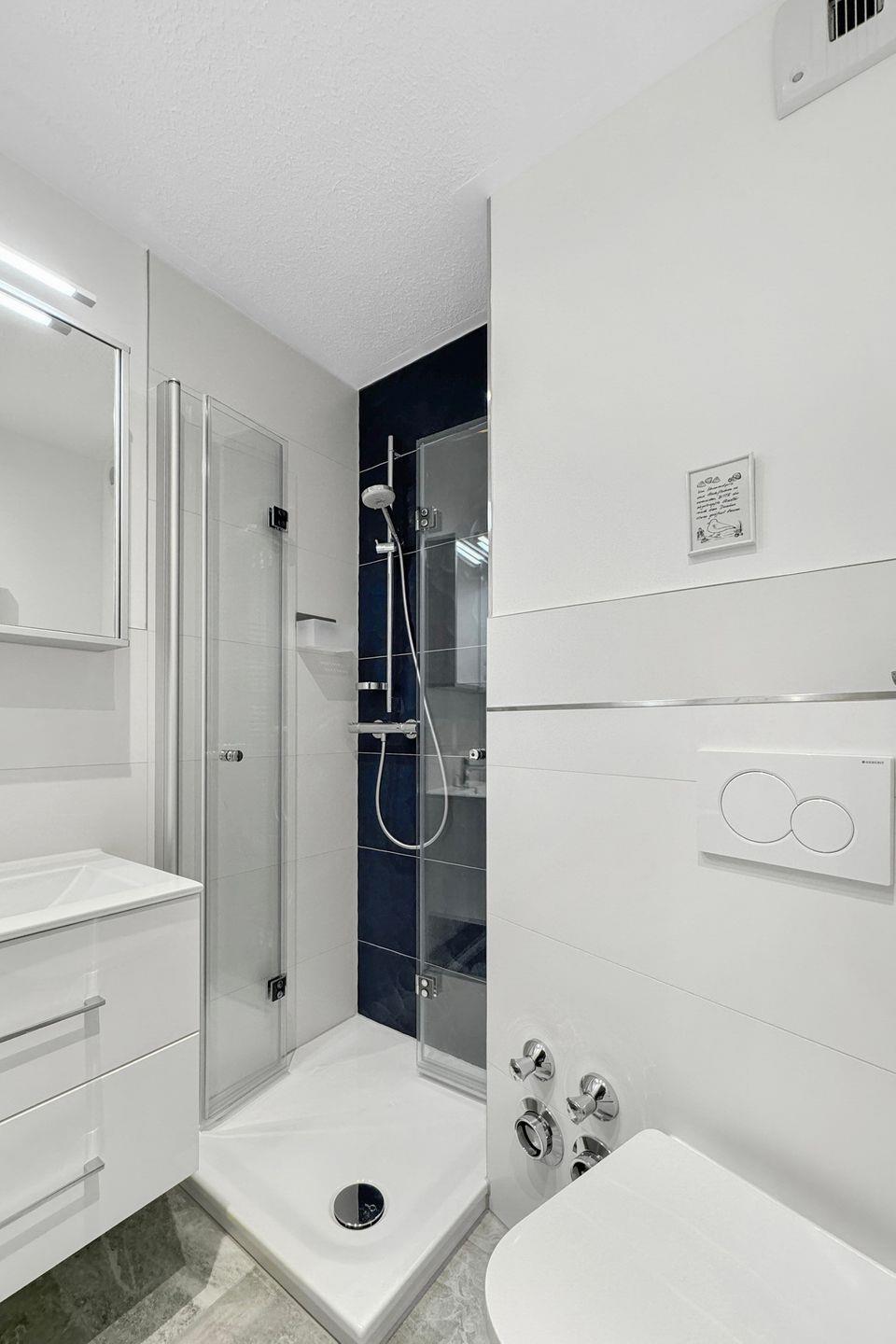 Dass innenliegende Duschbad verfügt über einen Handtuchheizkörper, WC, Dusche mit Glasduschkabine (flacher Einstieg), einen beleuchteten Spiegelschrank sowie Verstau- und Ablageflächen.