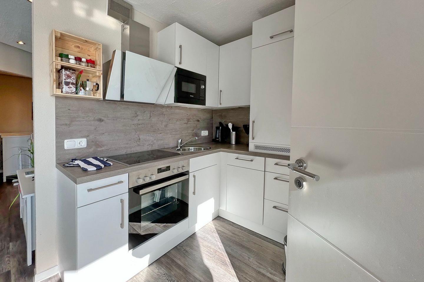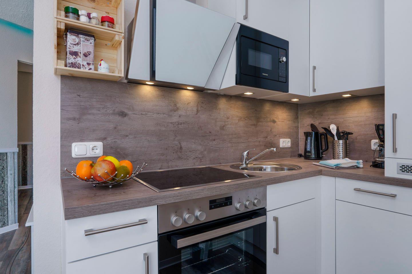 Die, zum Wohnraum, offene Einbauküche ist mit einem großen Kühlschrank, einem Cerankochfeld, einem Backofen, einer Spülmaschine sowie einer Mikrowelle und allen notwendigen Küchenutensilien wie Besteck, Geschirr, Kochgeschirr etc. ausgestattet.