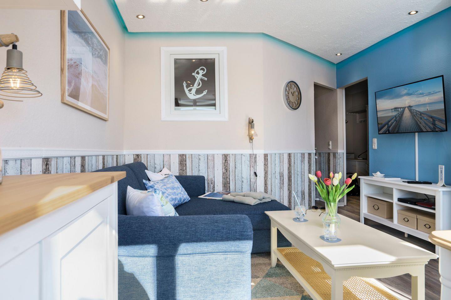 Im Wohnbereich stehen gemütliche Sitzgelegenheiten in Form einer Eck-Couch sowie eines großzügigen Essbereiches für max. 4 Personen zur Verfügung. Flatscreen-TV, DVD-Player sowie WLAN (50 mbits) und ein zusätzliches Internetradio stehen als technische Komponenten zur Verfügung. Ein Highlight im Wohnbereich ist die abgehängte Decke, welche an den Seiten mit einem Lichtband (mit Farbwechseleinstellung) versehen worden ist - so lässt sich in den Abendstunden eine besonders gemütliche Atmosphäre erzeugen. Grundsätzlich können alle Spots gedimmt werden - dies sorgt ebenfalls für eine gemütliche Stimmung.