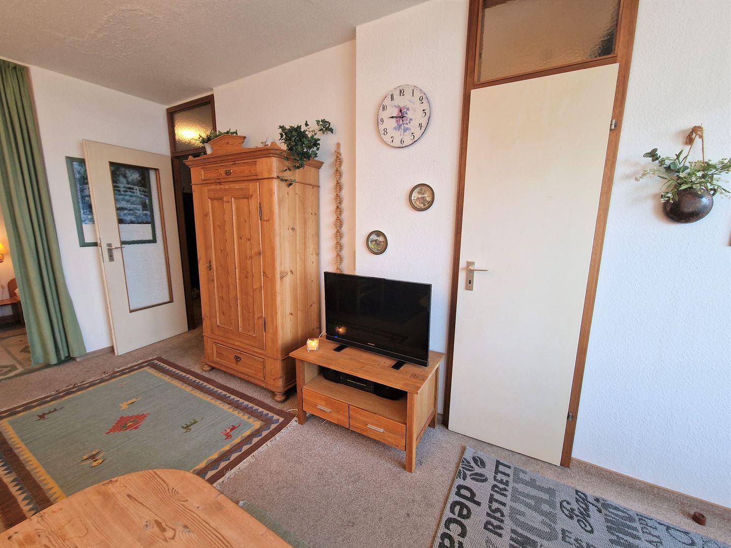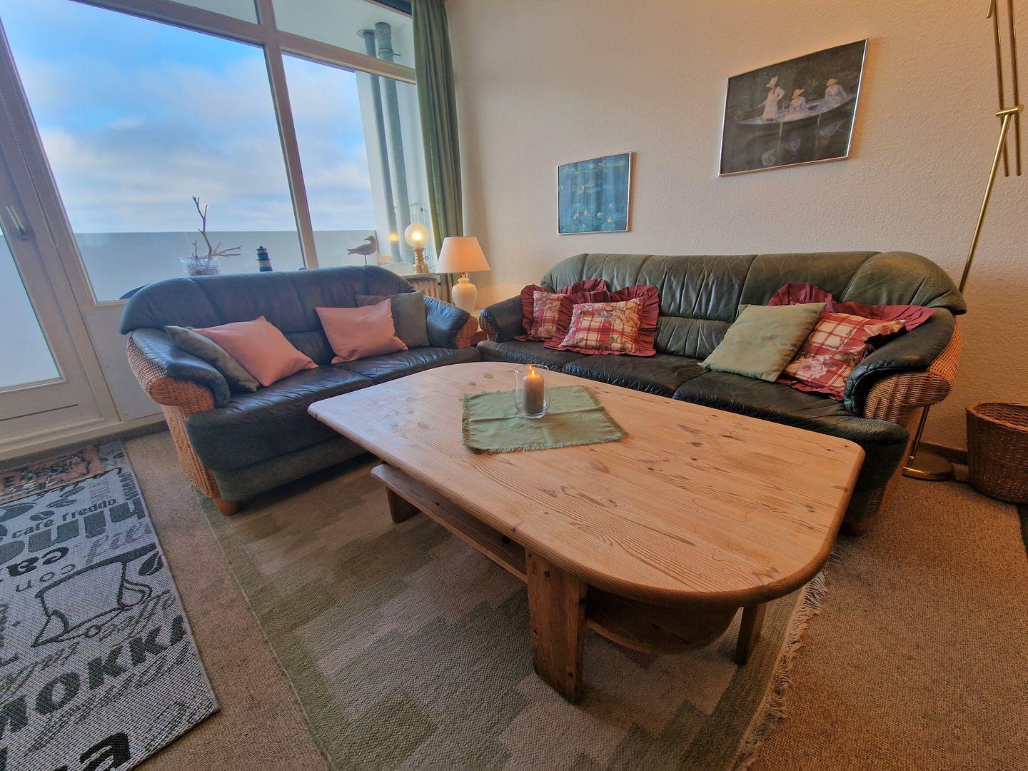 Wohnraum mit einer dunkelgrünen Ledercouchgarnitur, TV und Radio. WLAN kostenlos vorhanden. Die Essecke befindet sich im hinteren Wohnbereich.