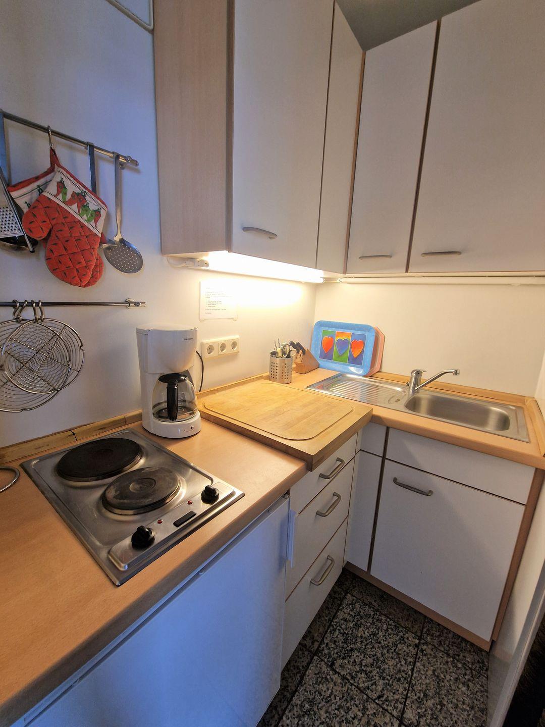 Küche mit 2-Plattenherd, Kühlschrank ohne Gefrierfach.