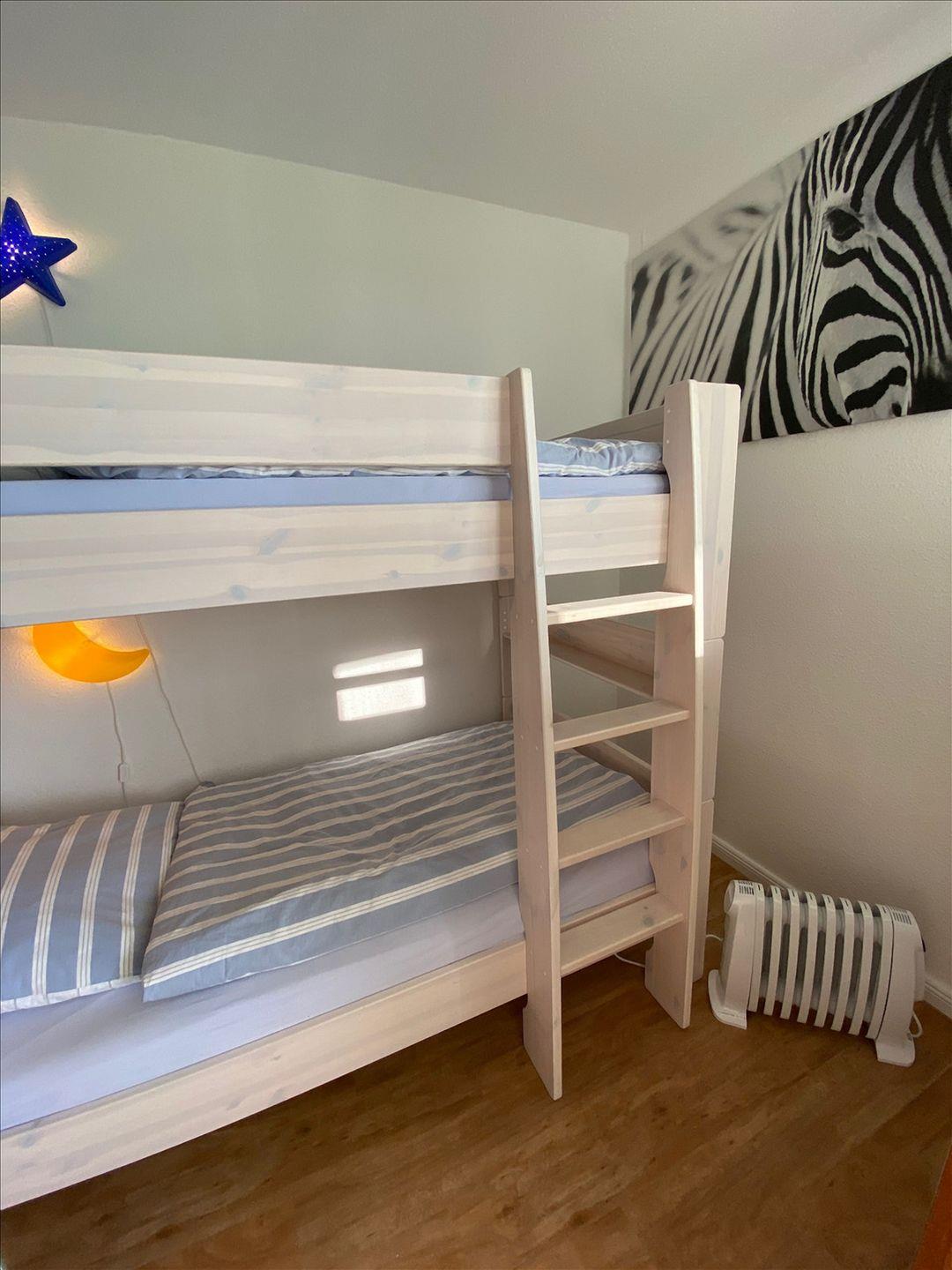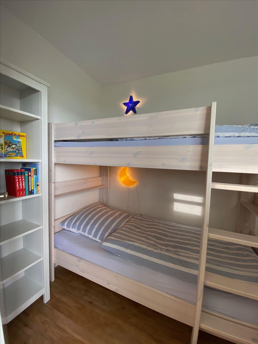 Elternschlafbereich mit zwei Einzelbetten (90 & 200 cm), separates Kinderzimmer mit Etagenbett (90 cm x 200 cm).