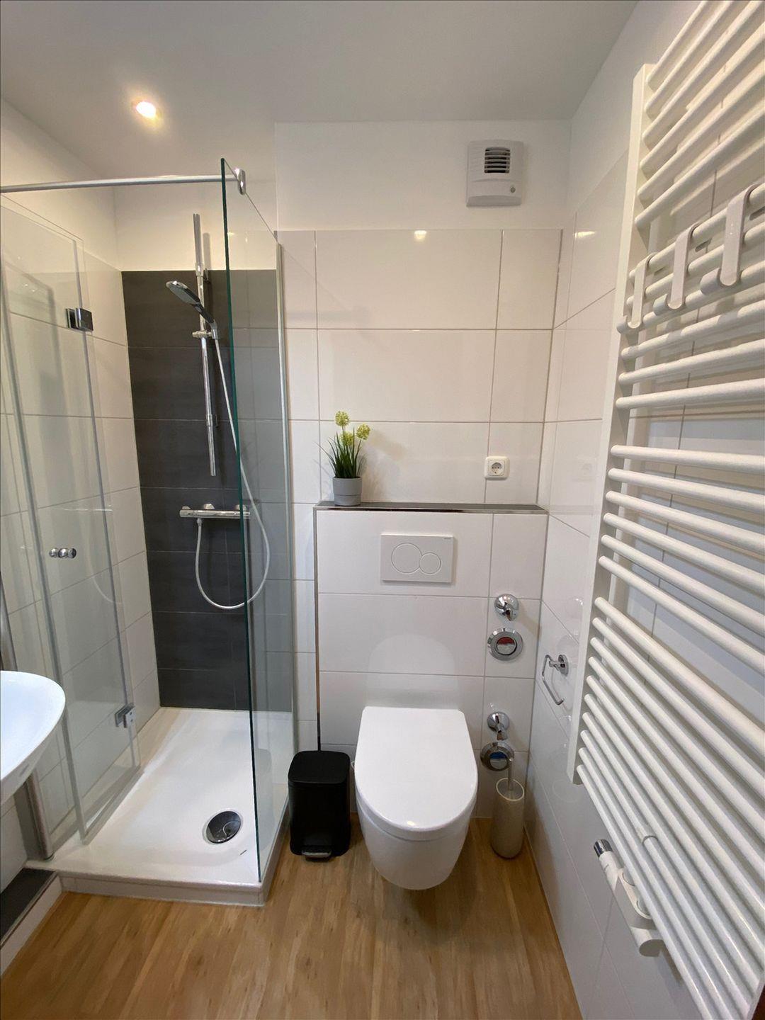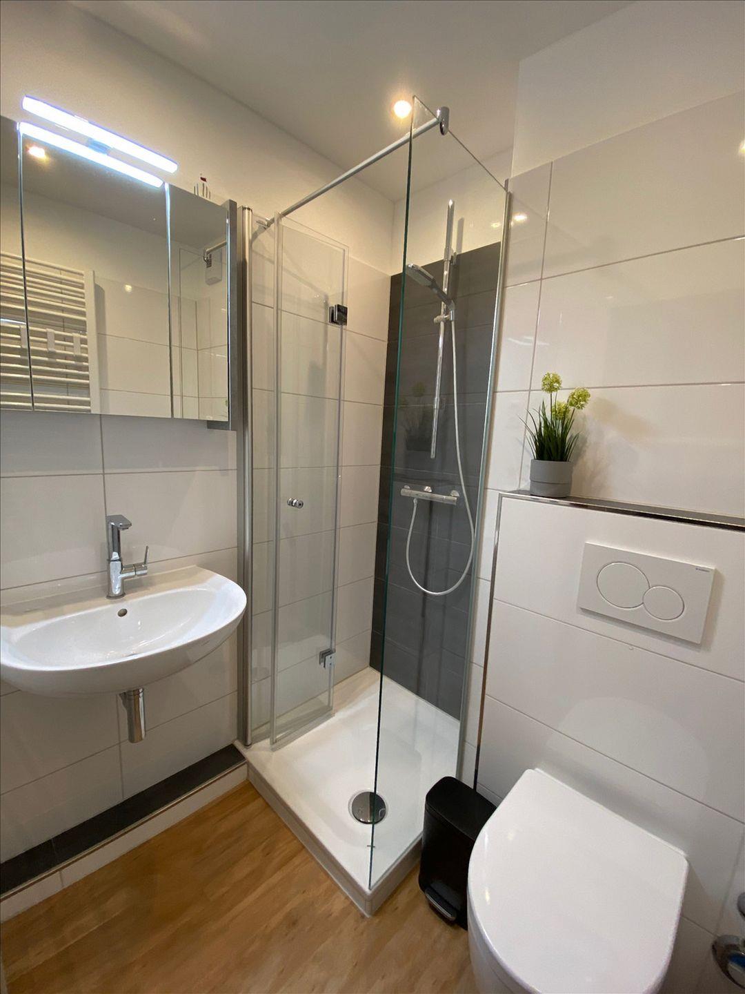 Helles, neu renoviertes Bad mit Duschkabine und WC.