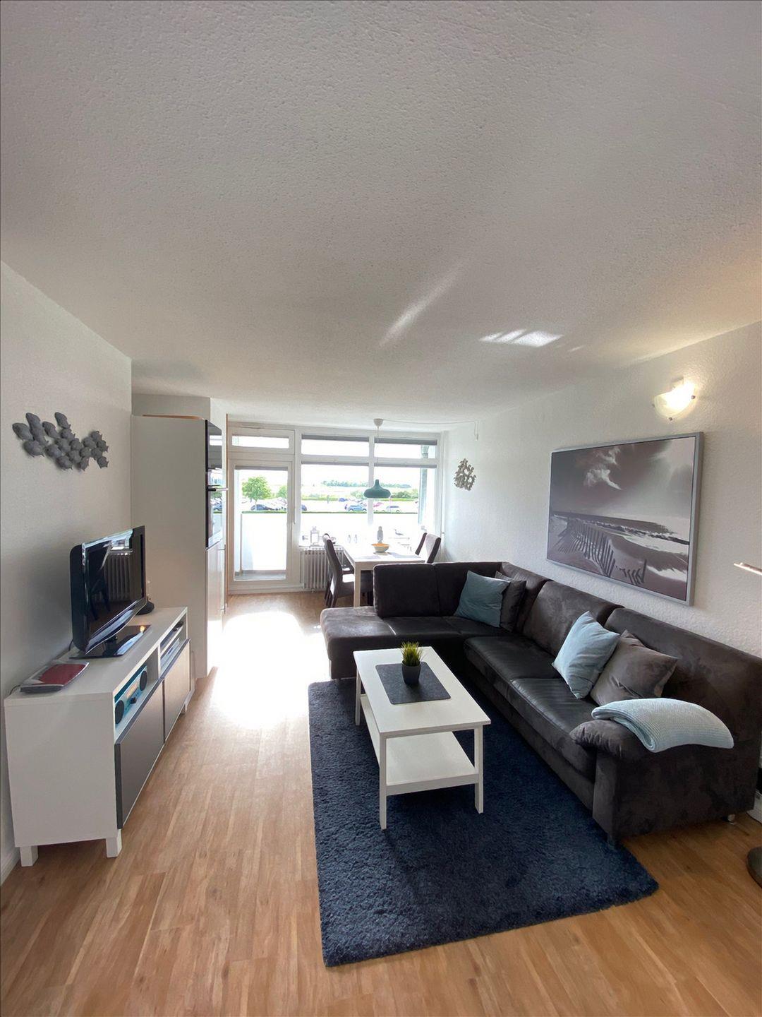 Wohnbereich mit einer gemütlichen Eck-Couch mit Ottomane, Flachbild-TV, HiFi-Anlage und DVD-Player. Gemütlicher Essbereich am Fenster. Alles Fenster sind mit Verdunklungsplissees ausgestattet.