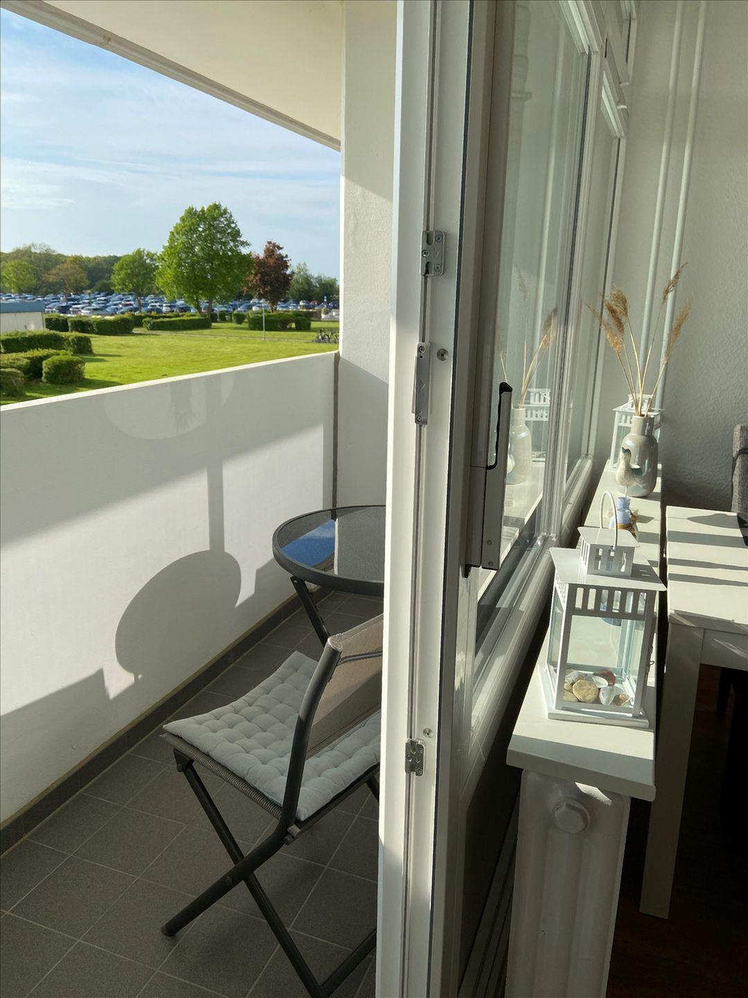 Sonniger Balkon mit Sitzgelegenheiten in Richtung Leuchtturm/Salzwiesen/Ostsee (Westseite).