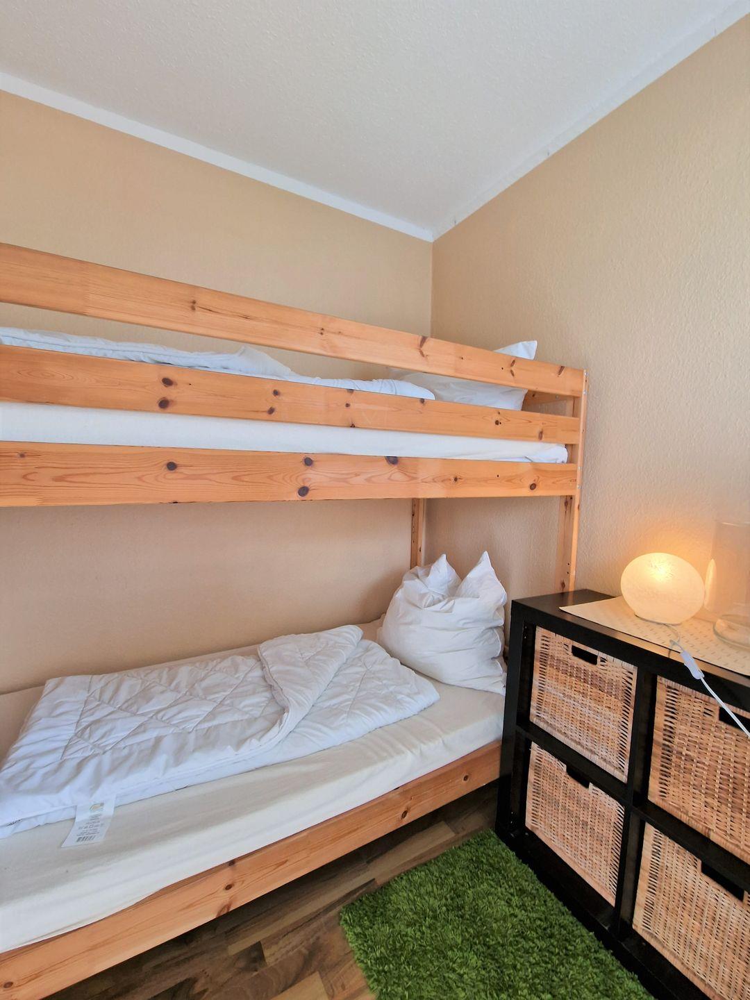 Der Elternschlafbereich ist durch Vorhang zum Wohnbereich getrennt und mit 2 Einzelbetten ausgestattet.