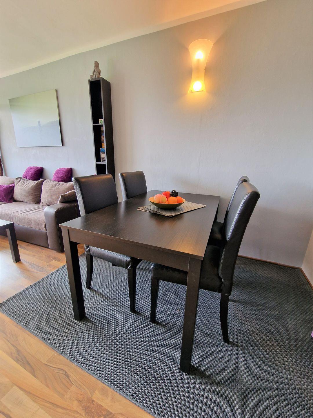 Wohzimmer mit Rundcouchecke, großem Flach-TV, Radio mit CD und integrierter Essecke.