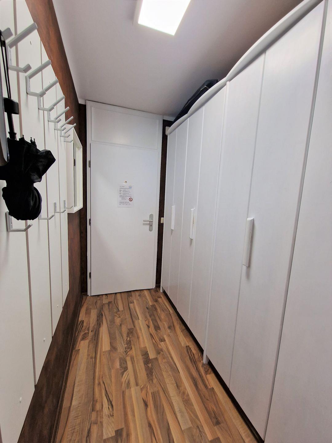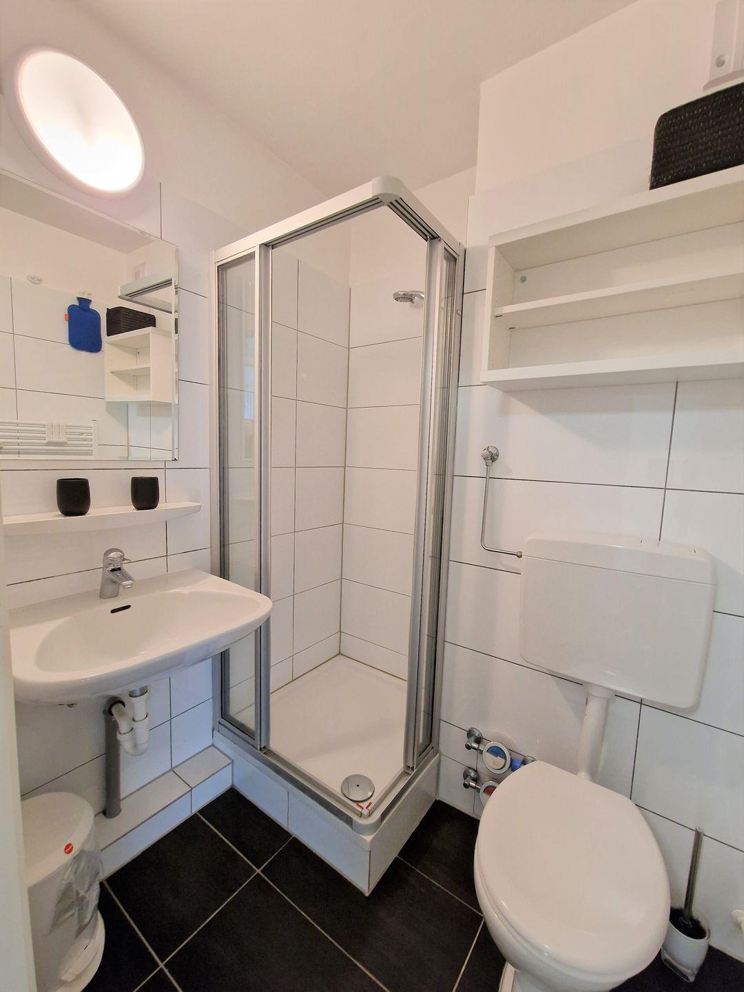 Das Badezimmer ist mit Duschkabine und WC ausgestattet.