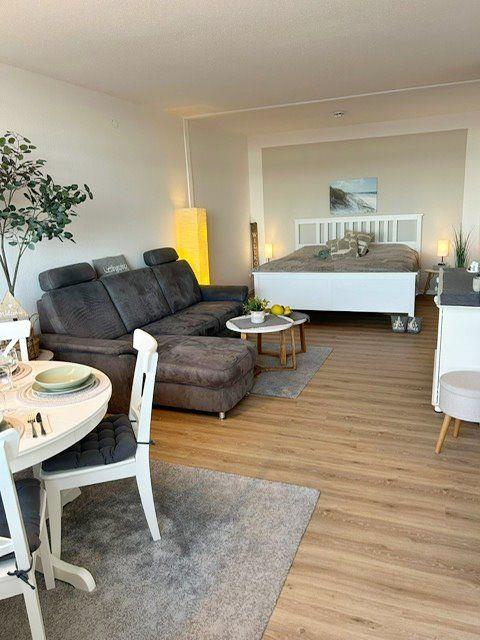 Die Wohnung besteht aus einem kombinierten Wohn-Schlafbereich mit bequemem Doppelbett im Schlafbereich. Im Wohnbereich sorgen ein Sessel sowie eine Sofaecke für Behaglichkeit, während der Essbereich am Fenster zum gemeinsamen Speisen einlädt. Ein Flachbild-TV ist natürlich ebenfalls vorhanden. Fenster mit Sichtschutz bieten Privatsphäre, während Sie vom möblierten Balkon den tollen Ausblick genießen können.