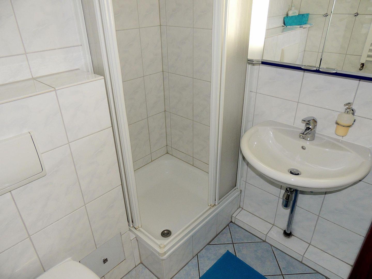 Im hellen und sanierten Bad steht den Gästen eine Duschkabine sowie ein Hänge-WC und ein großer beleuchteter Spiegelschrank sowie ein moderner Handtuchheizkörper zur Verfügung.