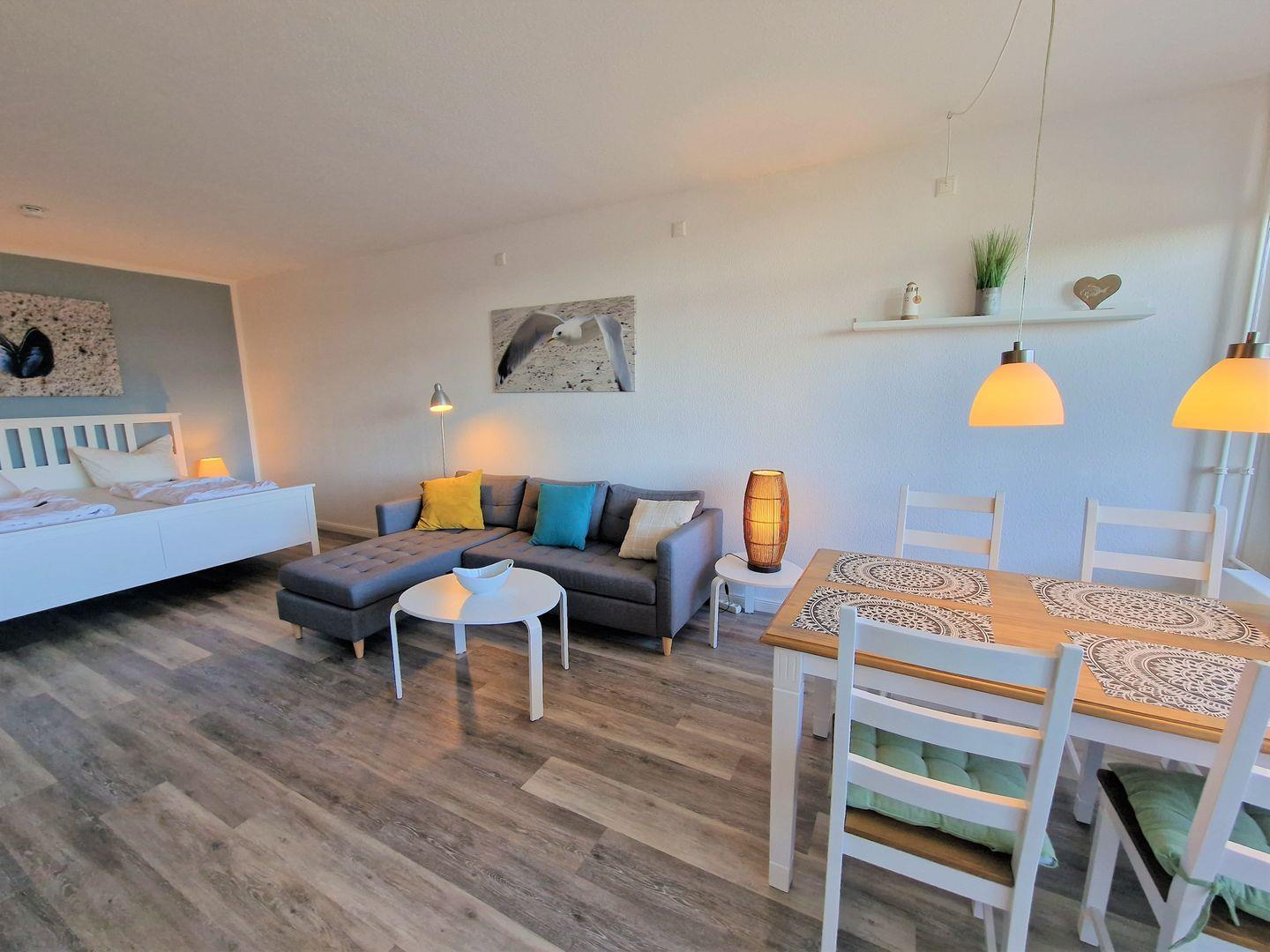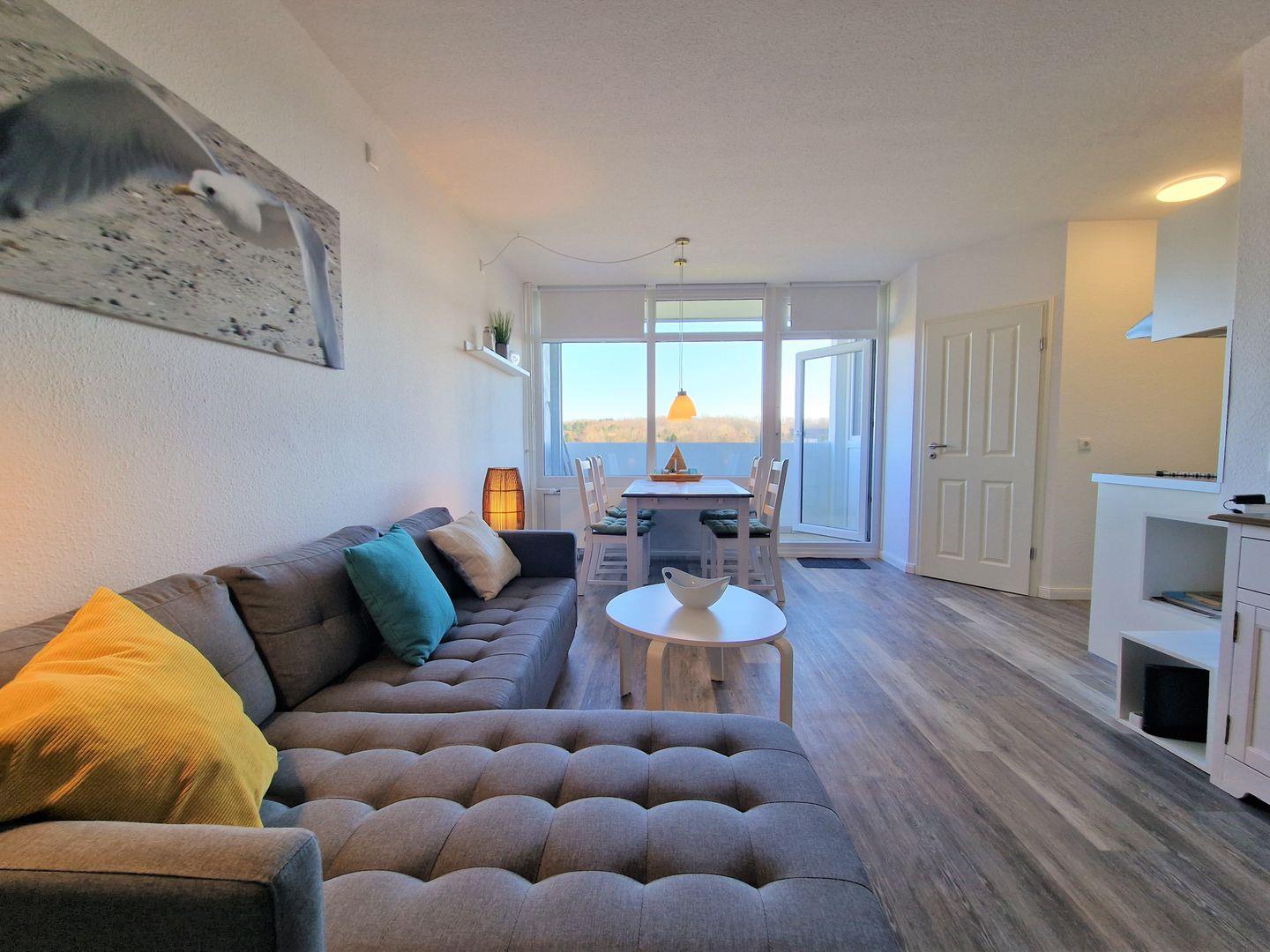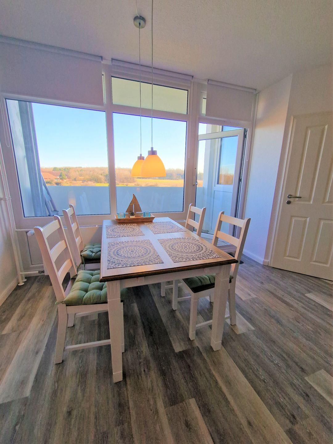 Hell und modern eingerichtet Wohnung in der 3.Etage mit Blick auf den Binnensee und die Salzwiesen im Süden.