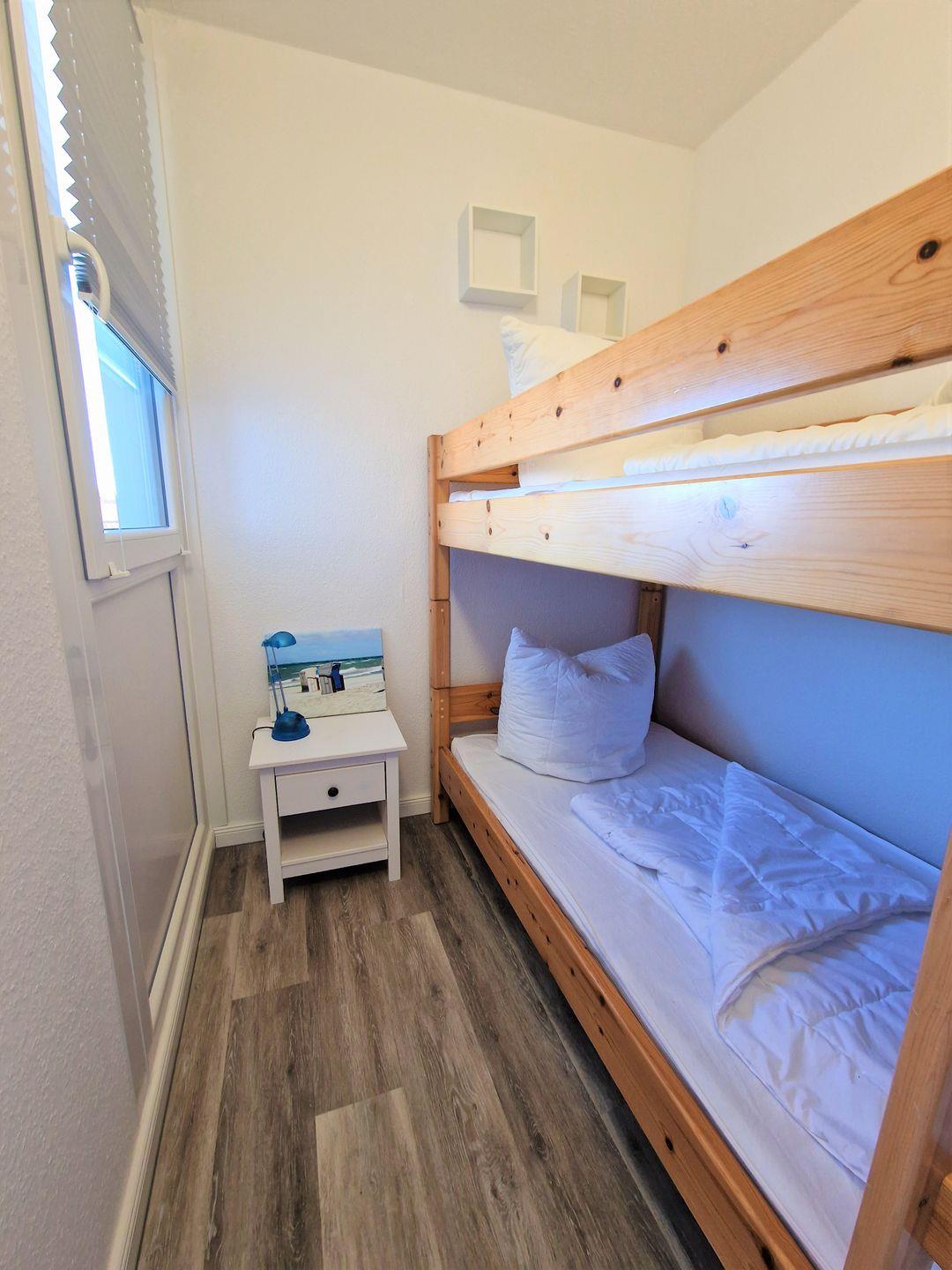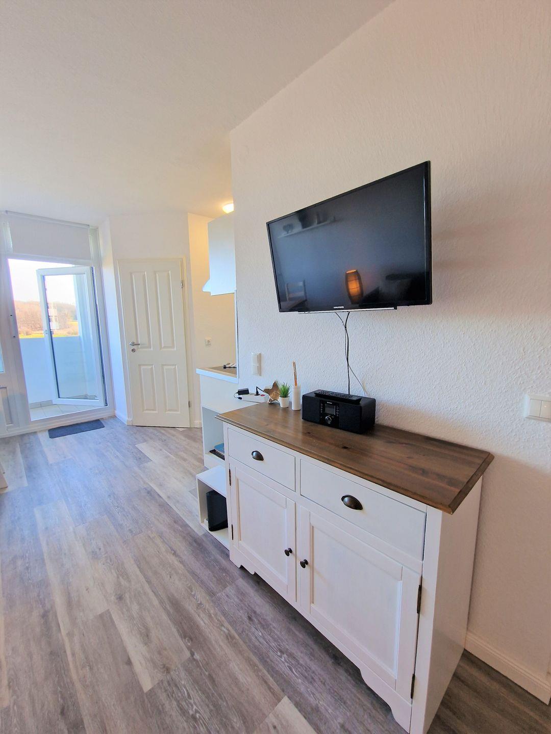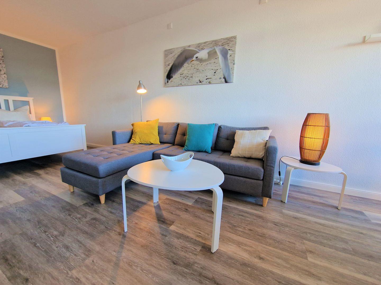 Hell und modern eingerichtet Wohnung in der 3.Etage mit Blick auf den Binnensee und die Salzwiesen im Süden.
