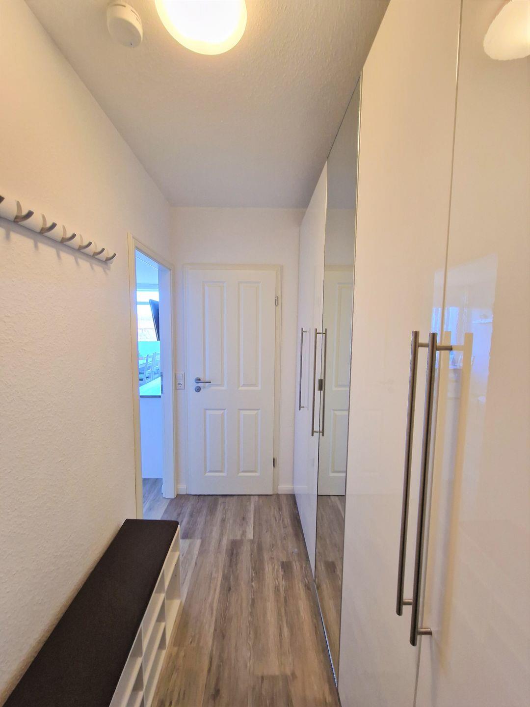 Im Flur befindet sich ein großer Kleiderschrank mit viel Stauraum, eine Garderobe und einem Schuhregal.