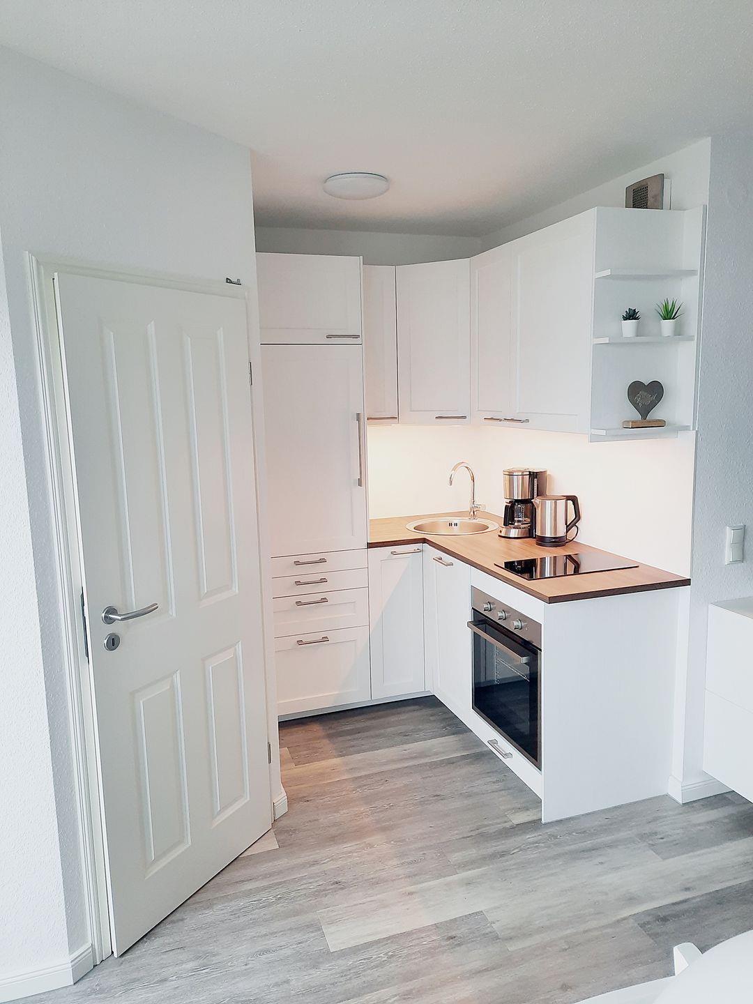 Die großzügige und offene Küche ist mit einem Ceran-Kochfeld, einer Spülmaschine und einem Kühlschrank mit Gefrierfach ausgestattet.