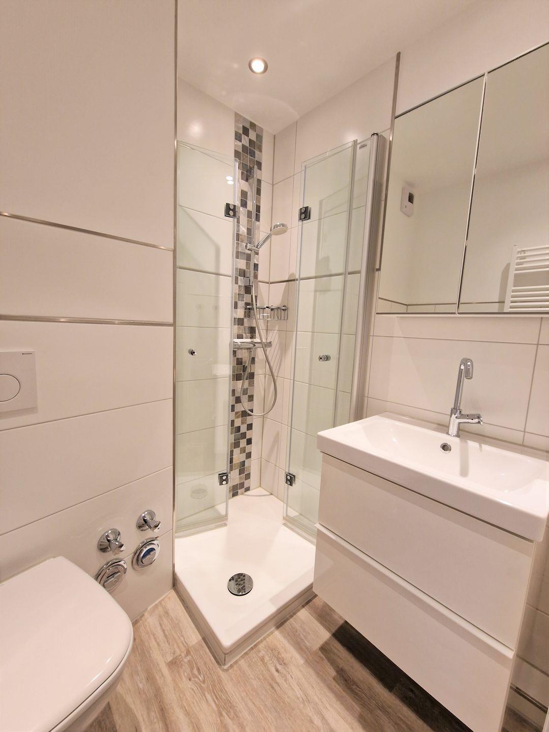 Das Badezimmer ist komplett neu und hell gefliest sowie mit einer Glasduschkabine ausgestattet. Ein Haartrockner steht Ihnen zur Nutzung zur Verfügung und braucht nicht mitgebracht werden.