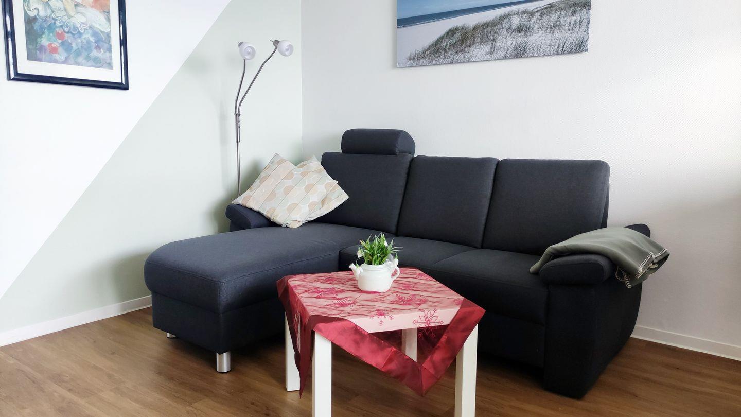 Der Wohnbereich ist mit einer L-Couch zum Verweilen eingerichtet. Der integrierte, direkt am Fenster befindliche Essbereich läßt Sie am hohen Esstisch mit Barhockern direkt über auf die Ostsee schauen.