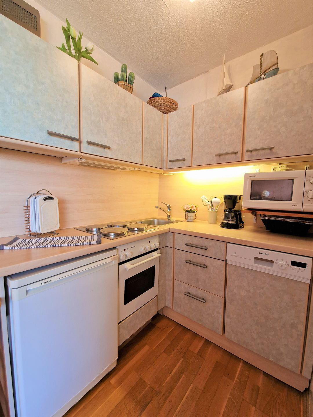 Küche mit 4er-Plattenherd, Backofen, Kombi - Mikrowelle, Toaster und Geschirrspüler ausgestattet.