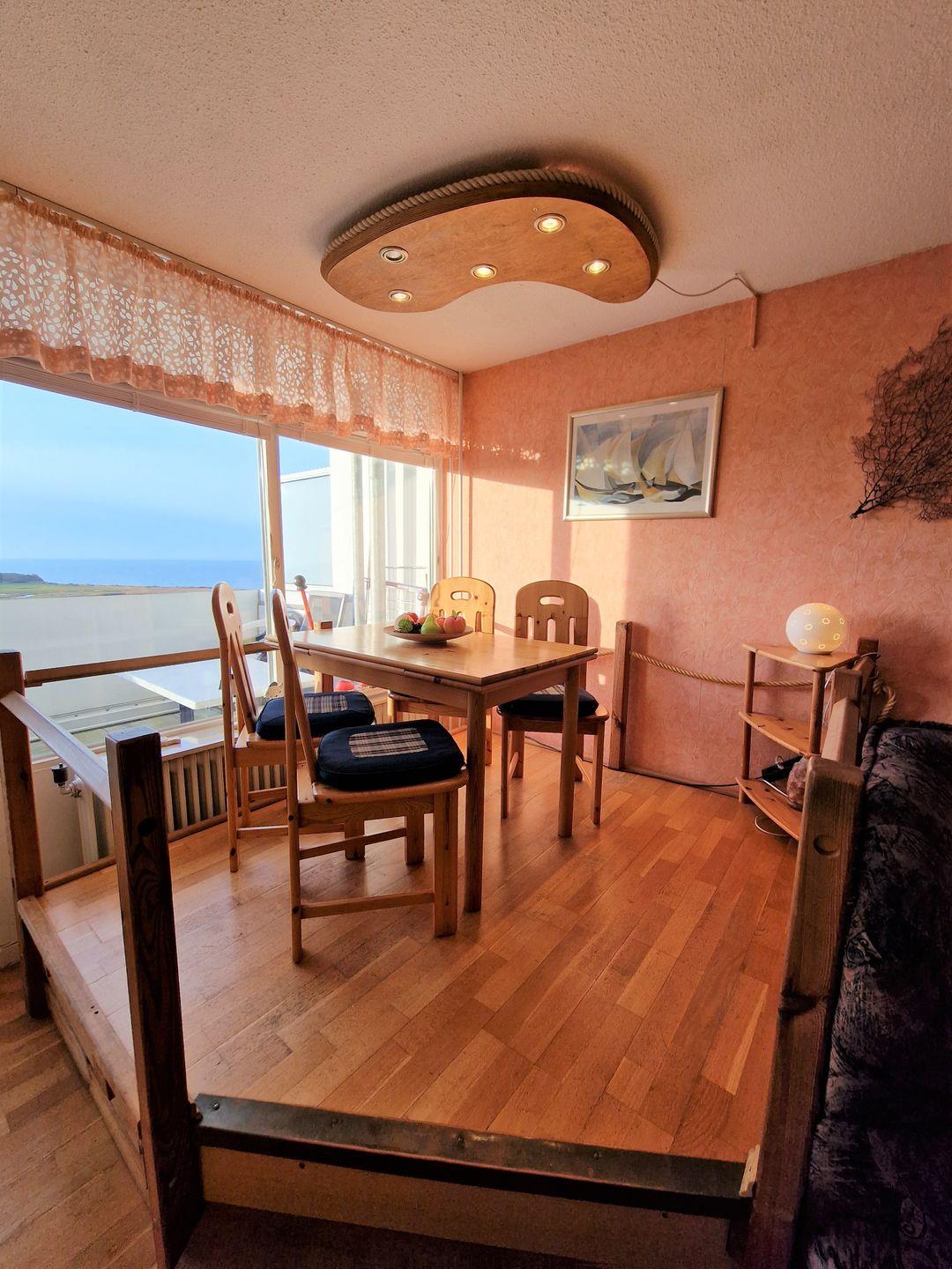 Der Wohnraum besteht aus einem Ecksofa. Die moderne Essecke befindet sich direkt am Fenster auf einem Podest.