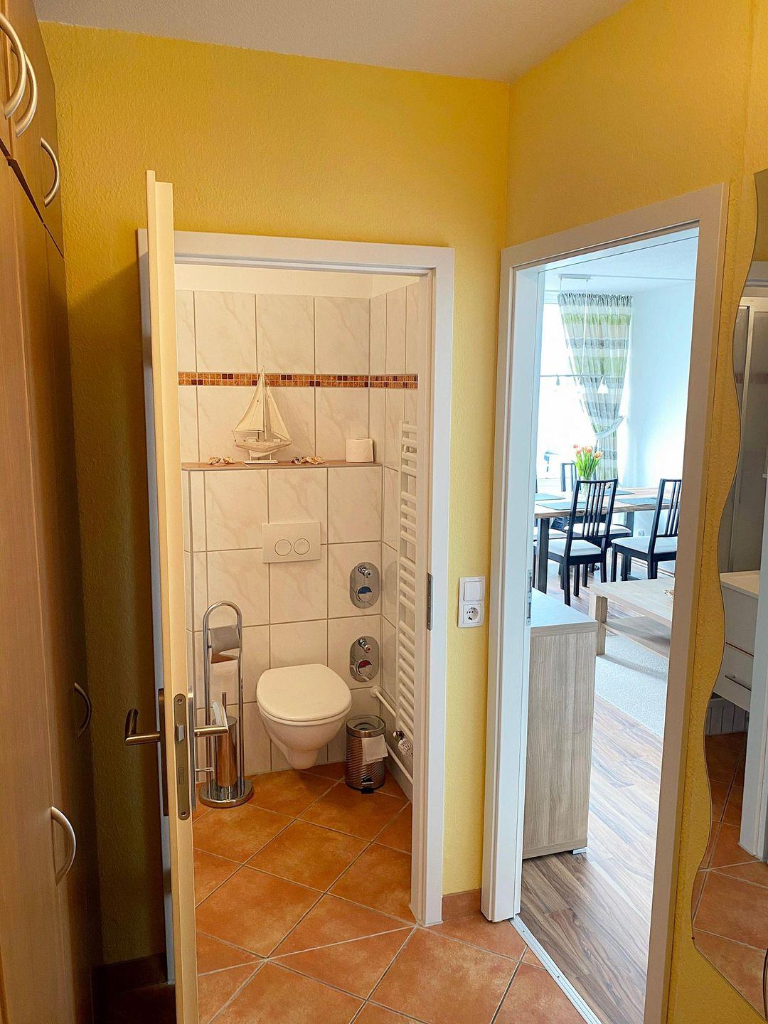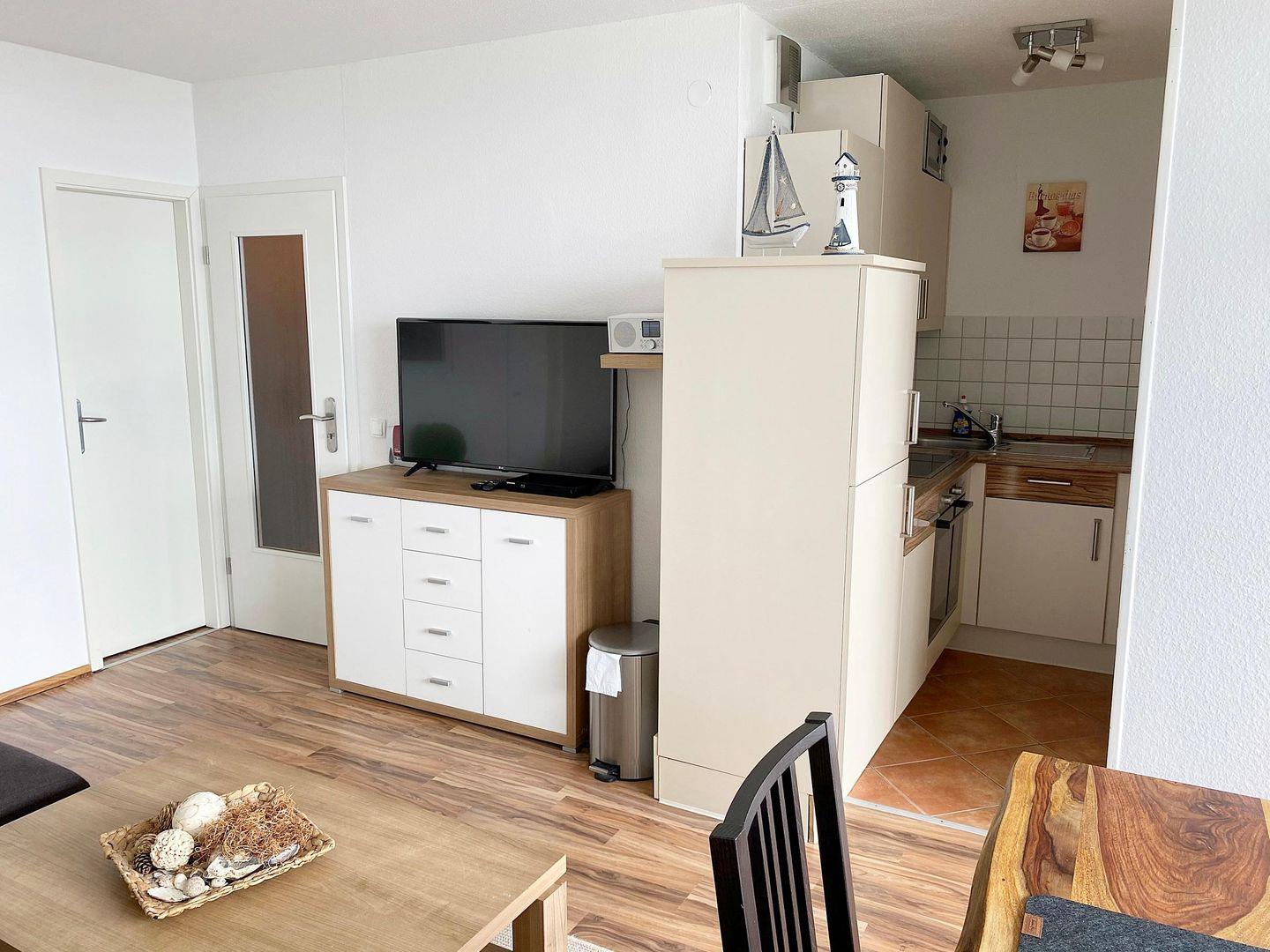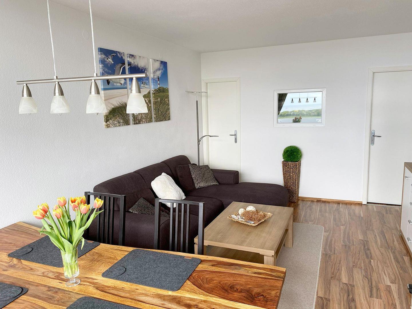 Die Wohnung ist mit Laminat ausgestattet. Wohnraum mit einer gemütlichen Couch in L-Form und einem großen Esstisch aus Echtholz am Fenster, Smart-TV, DVD-Player, CD-Stereo-Musikanlage, Highspeed-Internetanschluss. Diverse Bücher, Spiele und DVD's sind vorhanden.