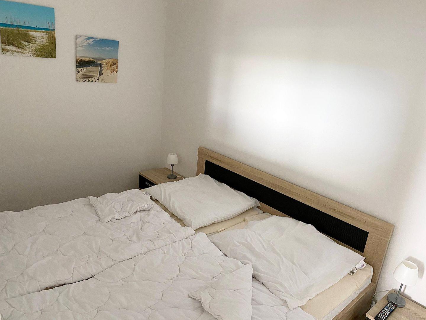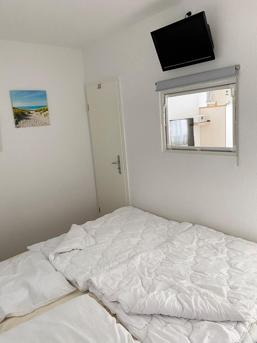 Das Schlafzimmer mit großem Doppelbett (1,8x2m mit 2 getrennten Matratzen) ist mit Türen zum Wohnbereich abgetrennt und hat einen zweiten LED-TV. Sep. Kinderzimmer mit Etagenbett je 90x200cm).