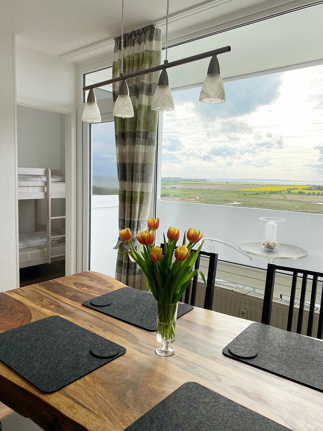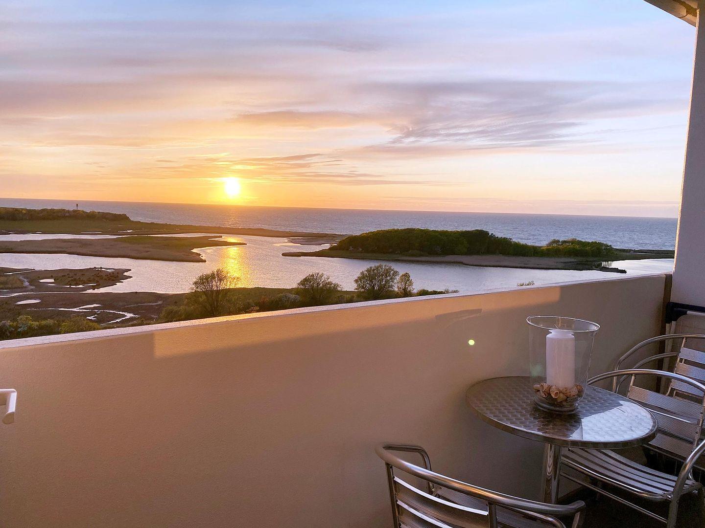 Atemberaubender Ausblick aus der 11. Etage auf Ostsee und Salzwiesen: Moderne und gemütliche Ferienwohnung mit Balkon zur Westseite und 50 MBit/s Highspeed-Internet.