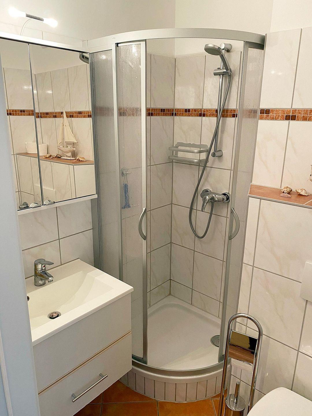 Schick renoviertes Bad mit Duschkabine und WC.