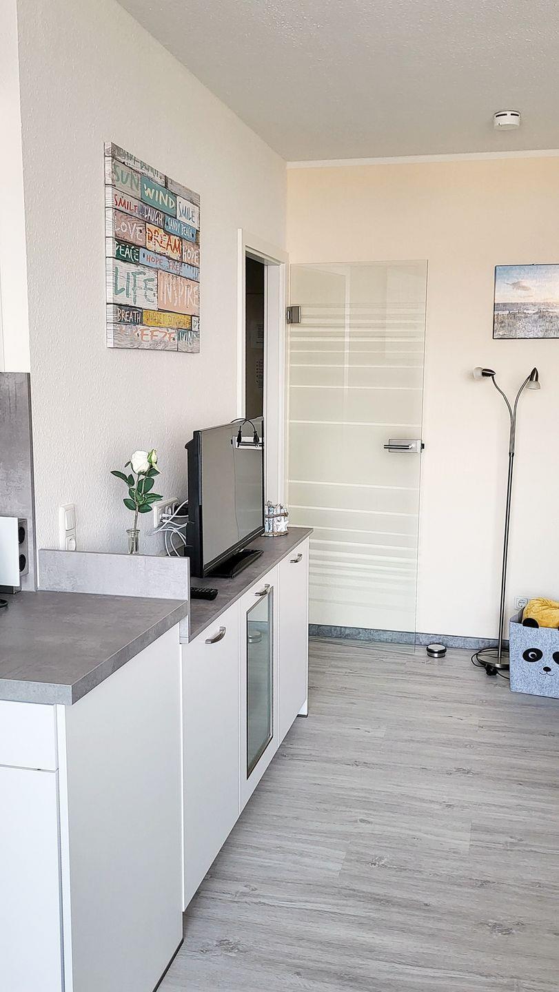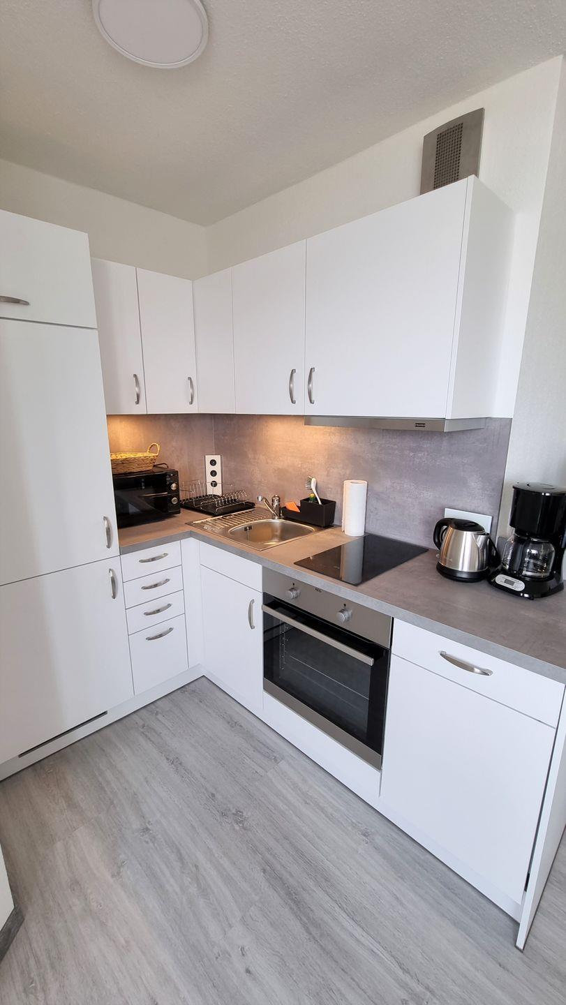 Die offene und helle Einbauküche ist mit einem Cerankochfeld (2 Platten), Backofen, Geschirrspülmaschine, einer Mikrowelle sowie allen notwendigen Küchenutensilien ausgestattet.