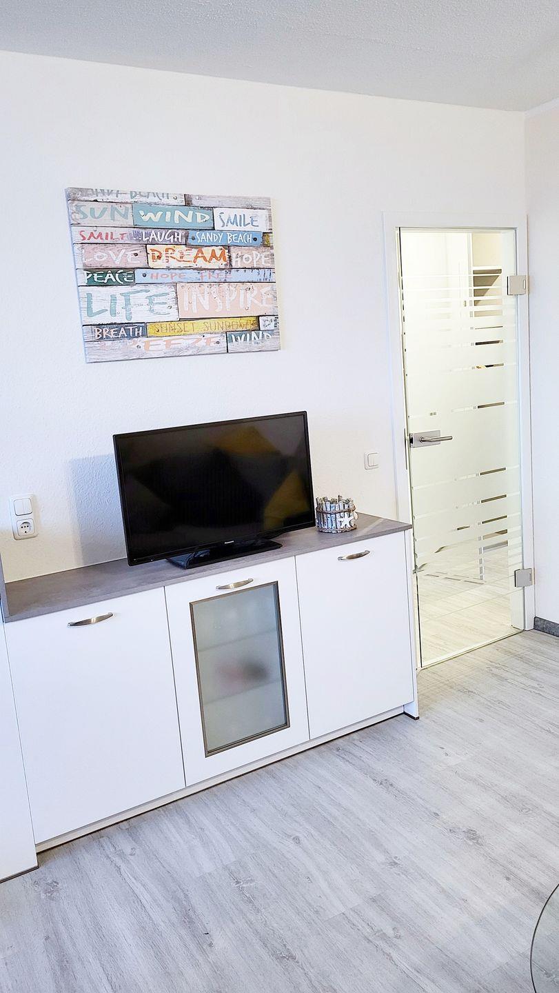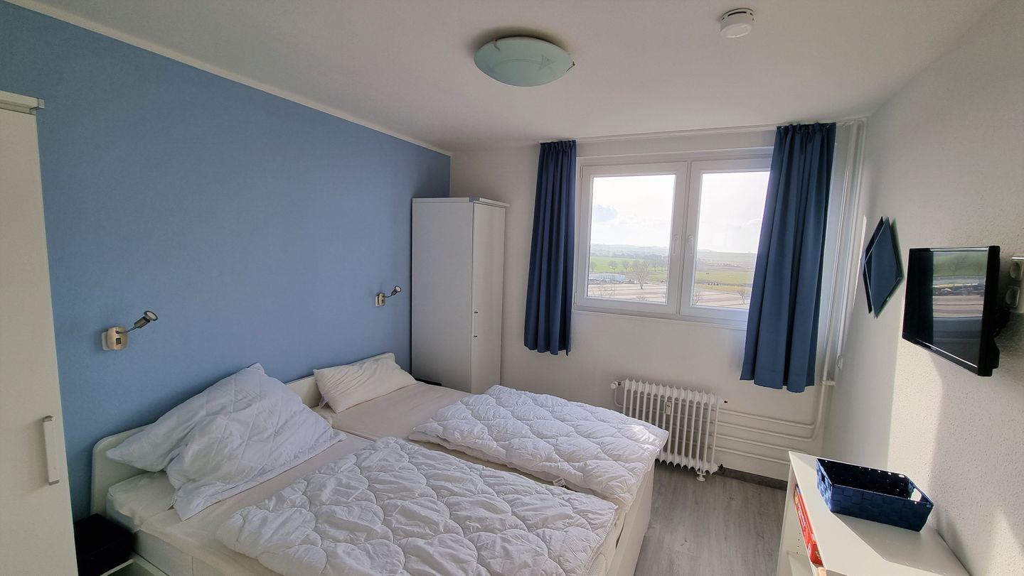 Das große Elternschlafzimmer (mit Tür) verfügt über großes Doppelbett (2 x 90*200), zwei Kleiderschränken sowie ein Fenster zum Öffnen (Rolläden vorhanden) mit Blick über die Salzwiesen. Vor dem Einschlafen können Sie auf dem Flachbild-TV-Gerät (60 cm Durchmesser) noch die Abendnachrichten schauen.