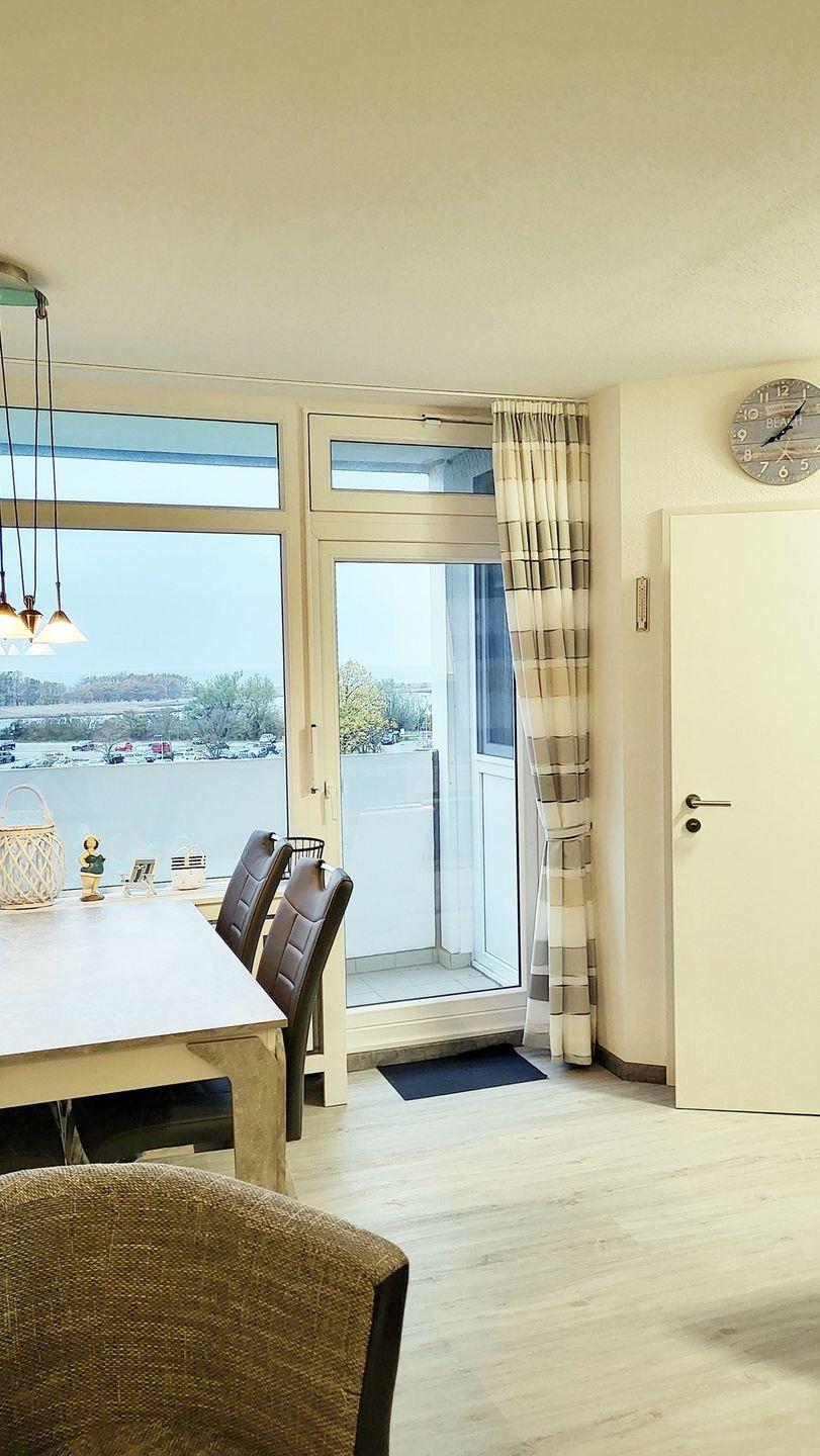 Direkt am Fenster gelegen befindet sich der Essbereich mit herrlichem Blick auf die Salzwiesen sowie zur Ostsee.