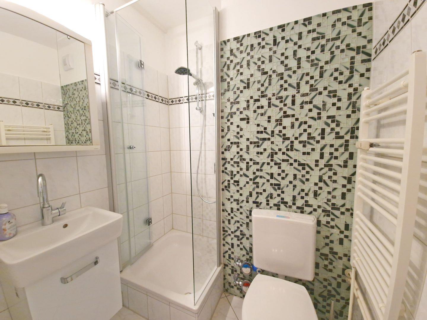 Das weiß geflieste Bad hat eine Dusche mit Glastür, Spiegelschrank, Handtuch-Heizkörper und ein WC.