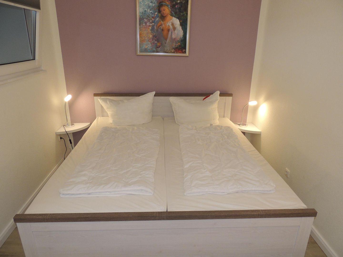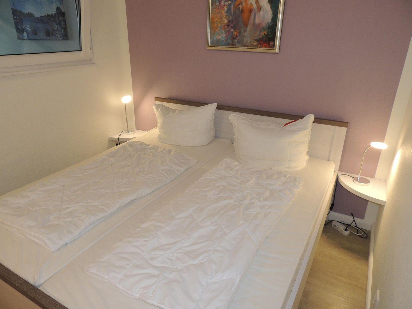 Der Schlafbereich ist separat vom Flur aus begehbar und ist mit einem Doppelbett, einer Kommode und einem kl. Flachbild-TV sowie einem Spiegel ausgestattet.