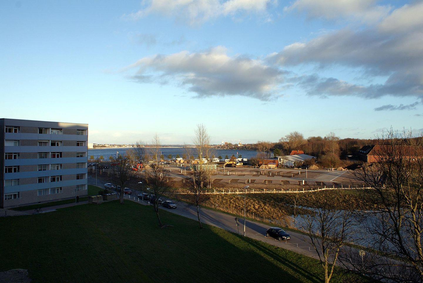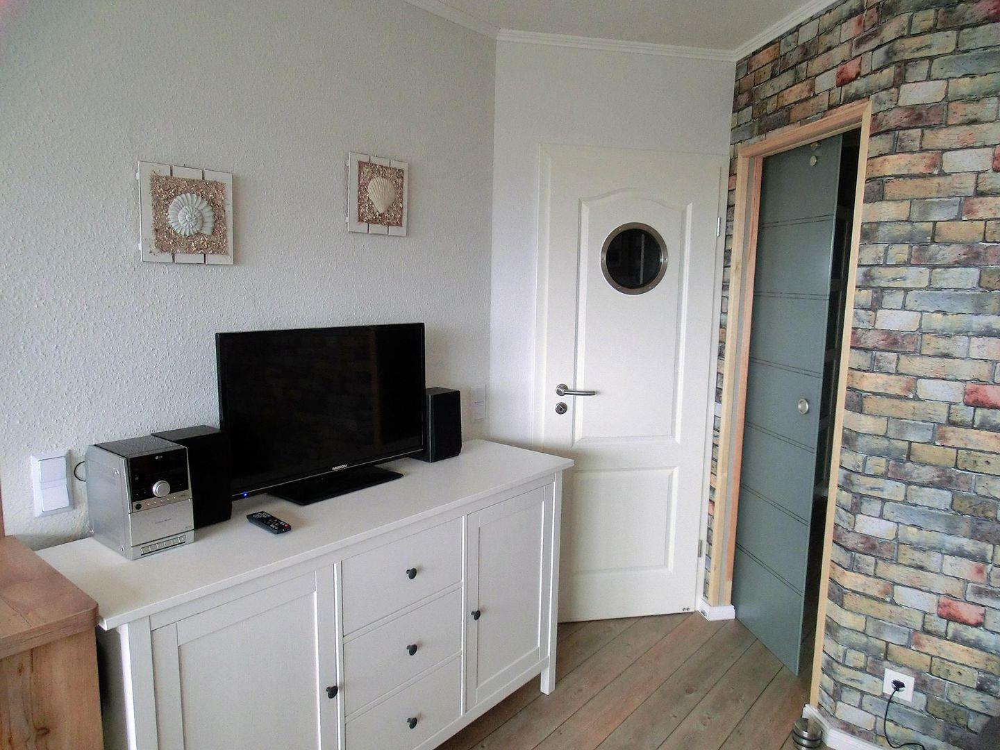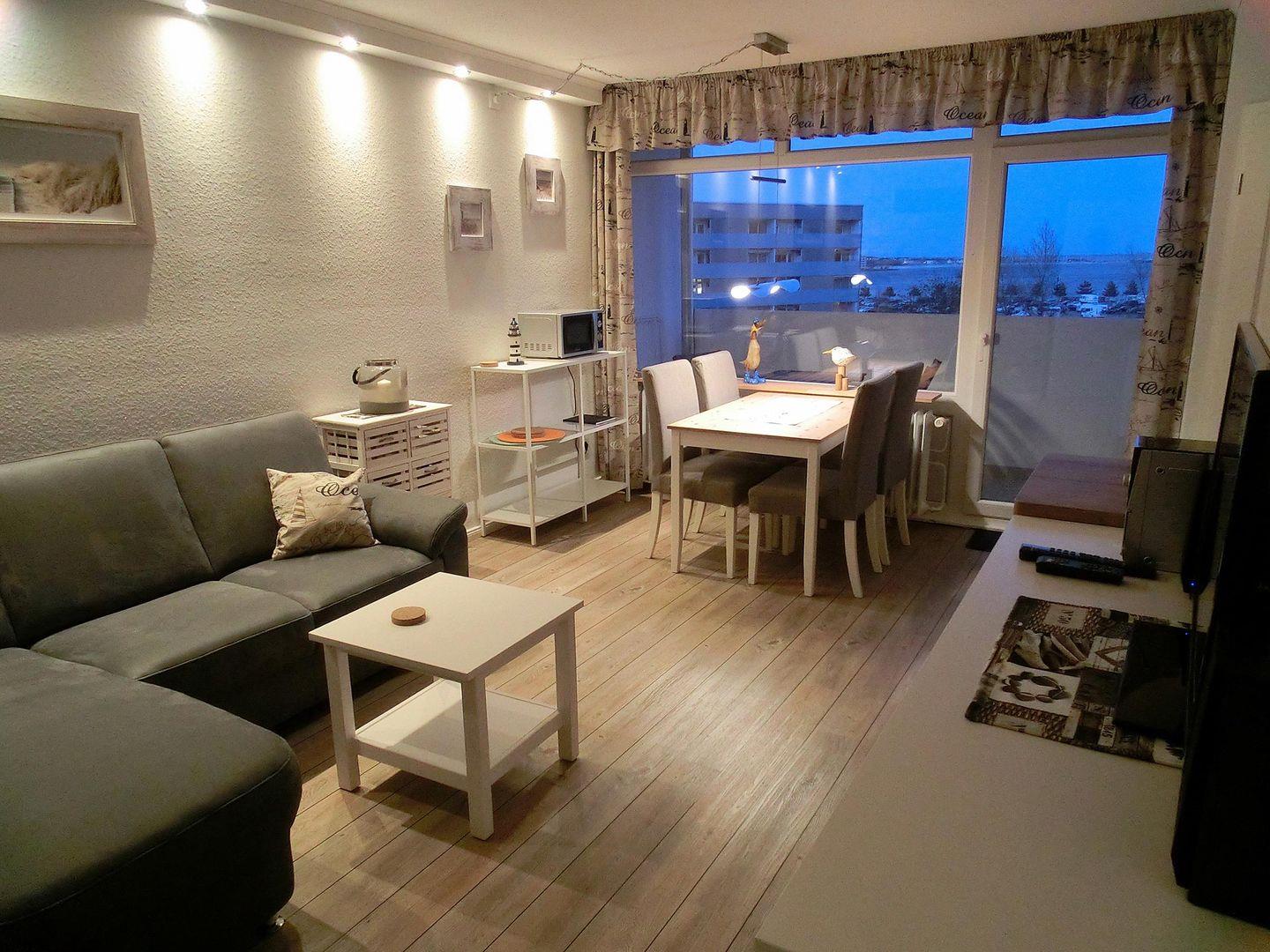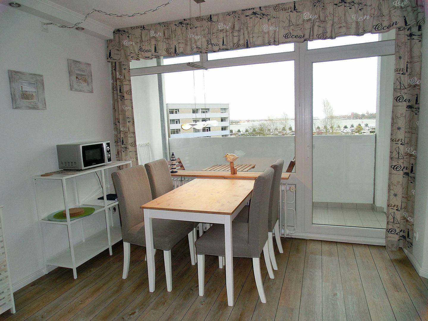 Frisch renovierte und maritime Ferienwohnung in der 4. Etage mit Balkon zur Ostseite mit Blick Richtung Binnensee.