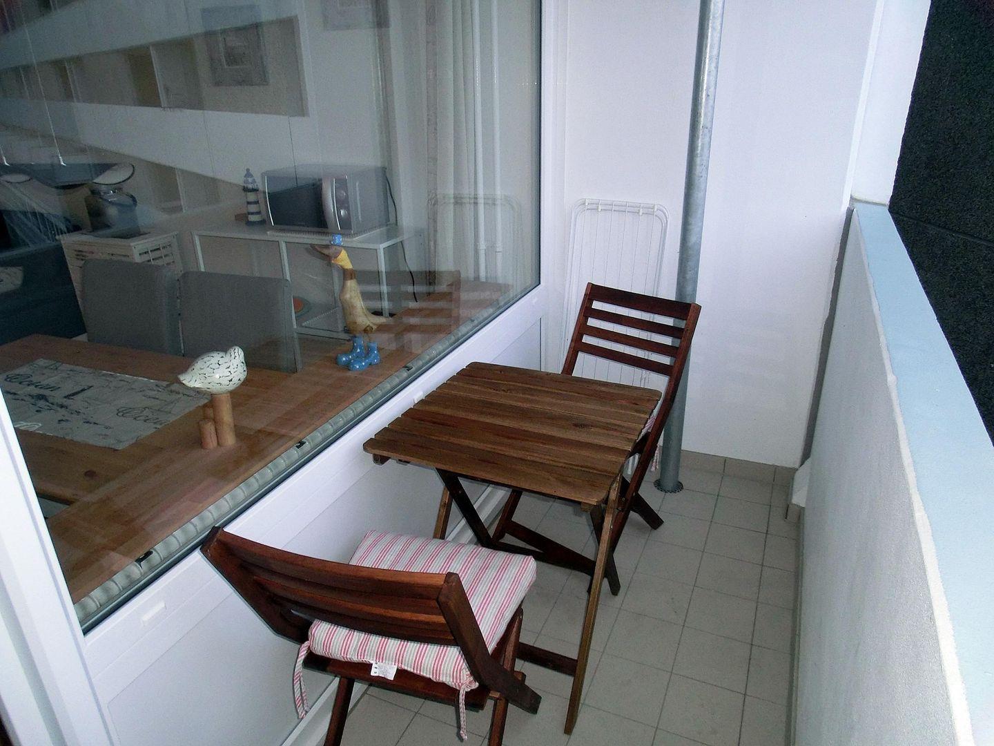 Auf dem sanierten Balkon sind Sitzgelegenheiten vorhanden; von hier aus haben Sie einen tollen Blick zur Ostseite.