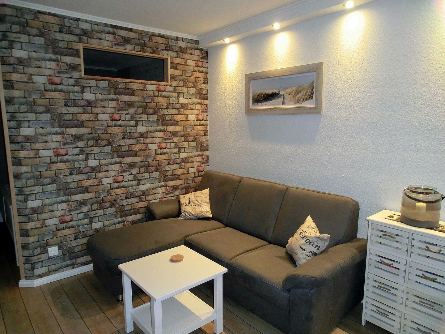 Der moderne Wohnraum ist mit einer gemütlichen Couchecke mit Flachbild-TV sowie einer Essecke am Fenster ausgestattet.