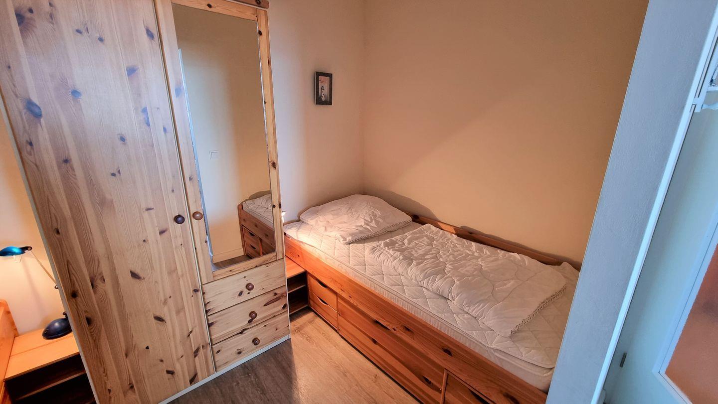 Der Schlafbereich ist mit einem Kleiderschrank und zwei Einzelbetten ausgestattet.
