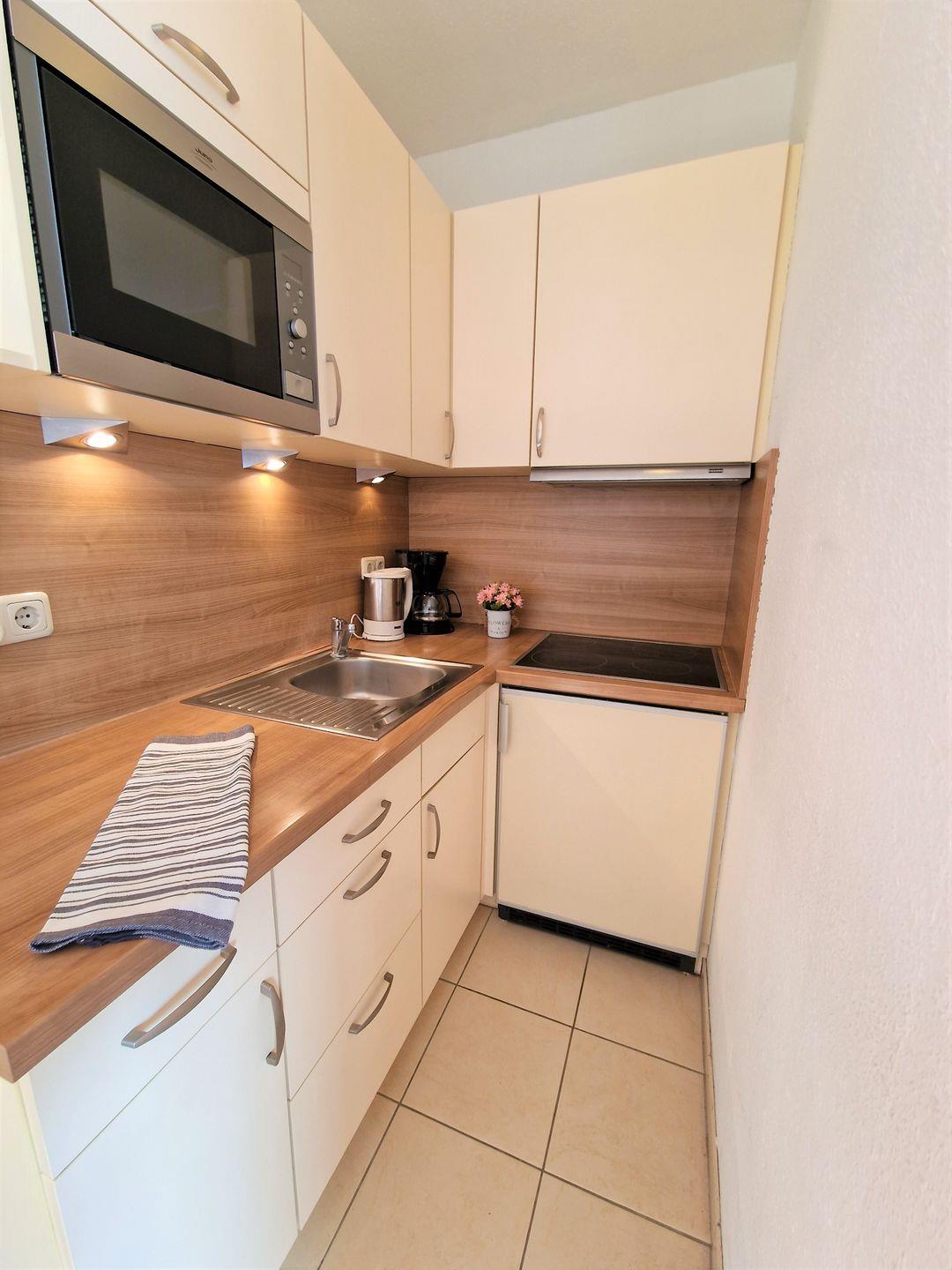 Die Kochnische ist mit allen notwendigen Küchenutensilien, einem Herd, einem Kühlschrank mit Gefrierfach, einer Mikrowelle sowie einer Kaffeemaschine und einem Wasserkocher ausgestattet. Der Esstisch bietet genügend Platz, um gemeinsam zu speisen und die Erlebnisse des Tages Revue passieren zu lassen.