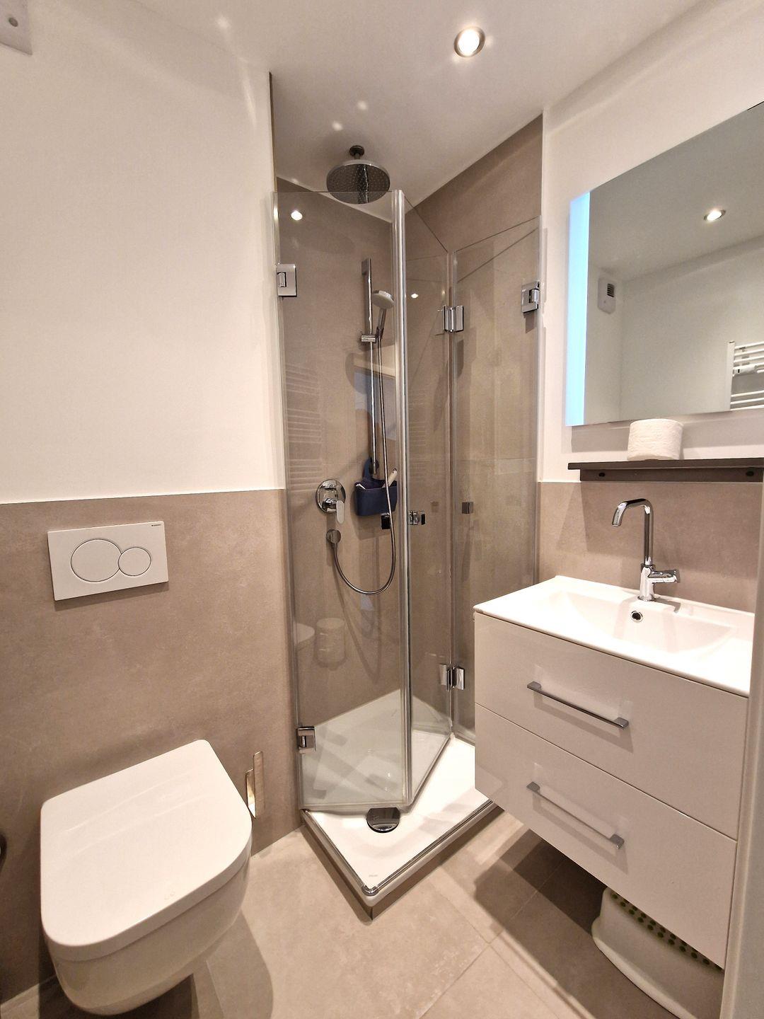 Saniertes und modernes Badezimmer mit Duschkabine und WC.