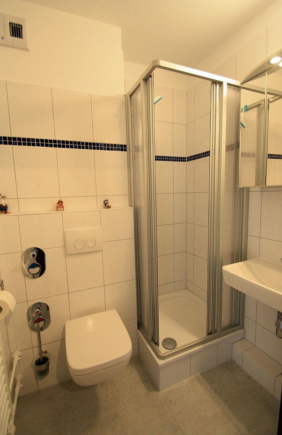 Das Bad hat einen Spiegelschrank sowie eine Duschkabine.