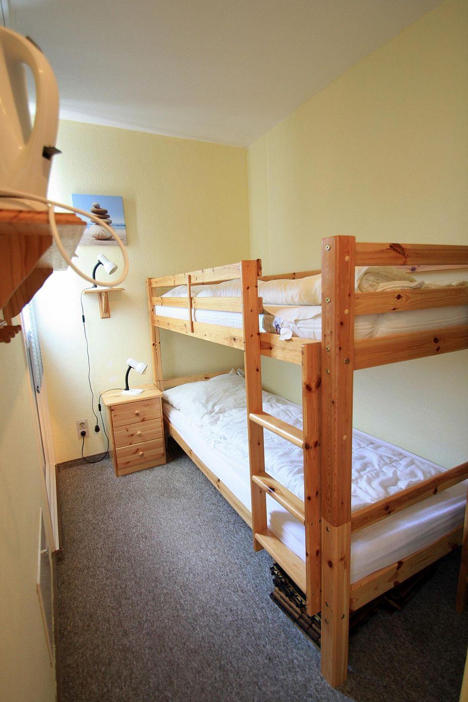 Das Kinderzimmer ist mit einem Etagenbett, Nachttisch und einem Regal ausgestattet.