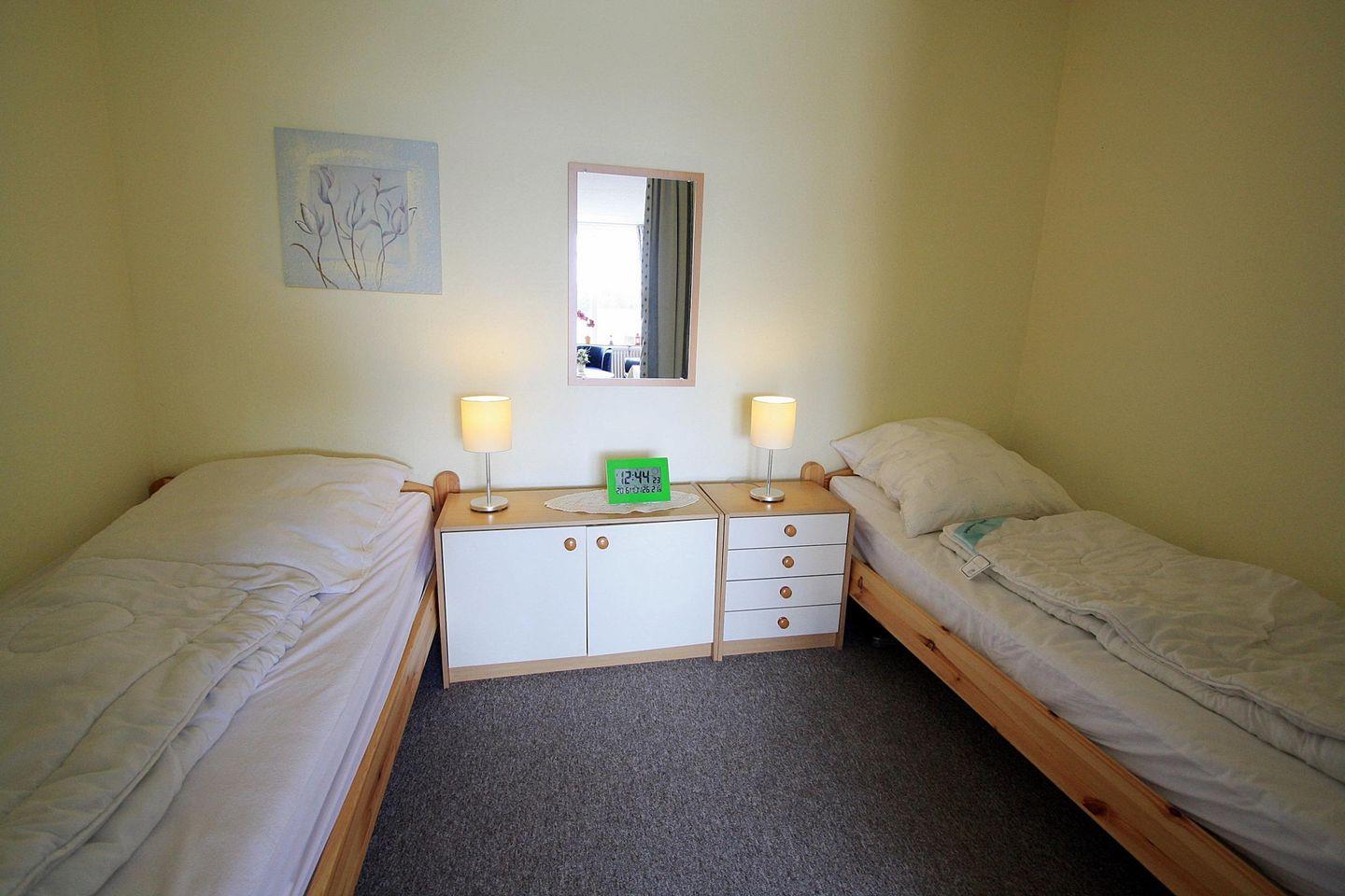 Im Schlafbereich, welcher durch einen Vorhang von Wohnbereich abgetrennt ist, stehen zwei Einzelbetten, ein Sidebord und ein Regal mit Büchern.