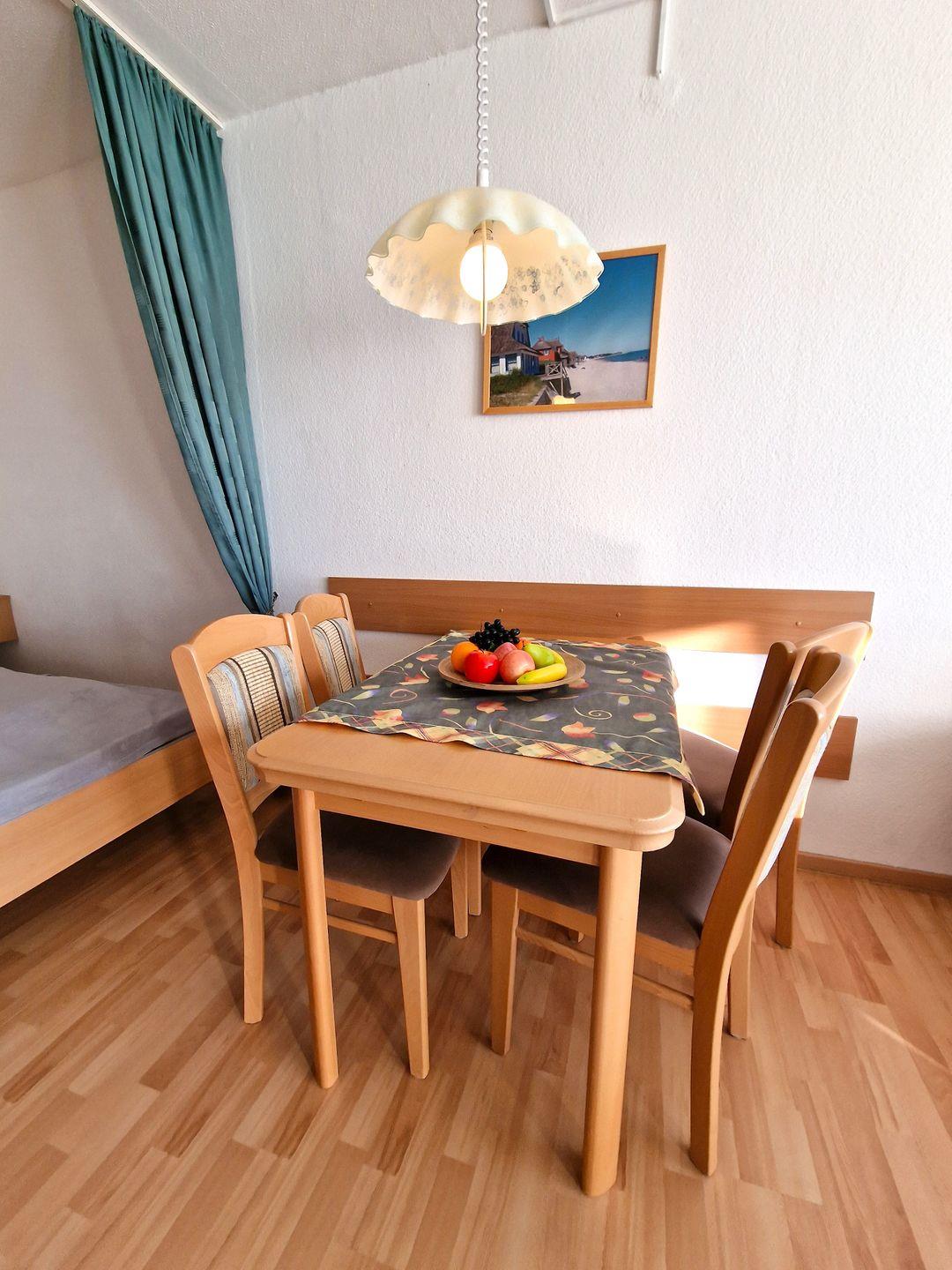 Die Wohnung ist mit Laminatfußboden im Wohnbereich, und Fliesenfußboden (Allergiefreundlich) ausgelegt. Ausgestattet ist sie mit einer modernen Couch (L-Förmig), ein Essplatz, ein Regalschrank, ein Flachbildfernseher, ein DVD-Player, ein Radio-Kassettenrecorder, und W-LAN.