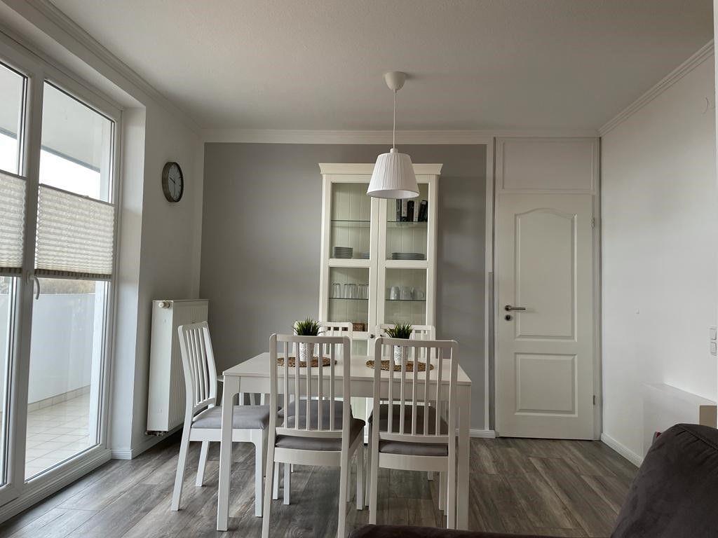 Die kleine, an den Wohnbereich angrenzende Küchenzeile wurde umfassend mit Geschirrspüler, 4-Feld-Ceranherd, Backofen, Kühlschrank mit Gefrierfach, Spüle und allen notwendigen Kochutensilien und Geschirr ausgestattet. Gleich neben der Küche nehmen Sie Ihre gemeinsamen Mahlzeiten am runden Esstisch mit Blick auf Binnengewässer und Meer ein.