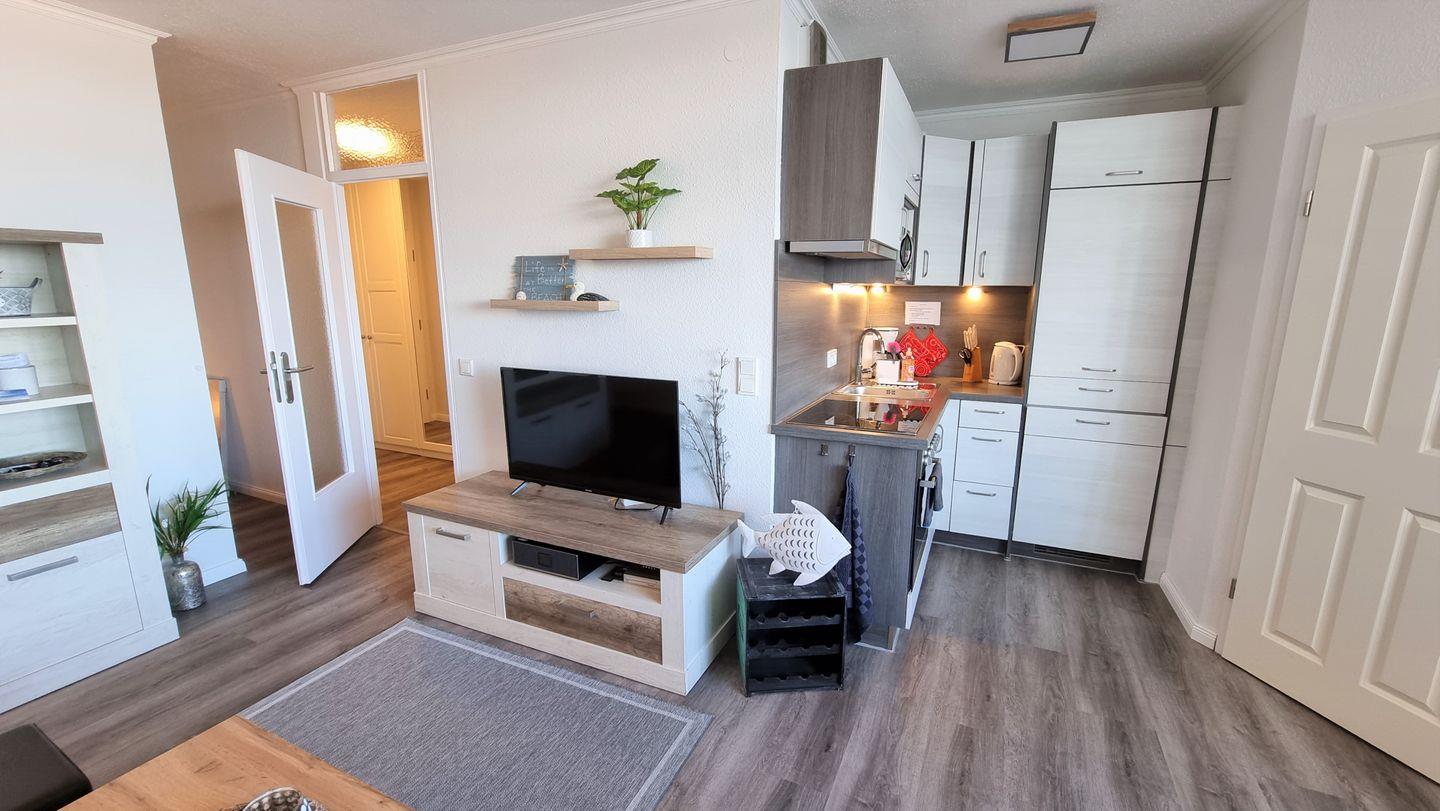 Die gesamte Wohnung ist mit einem Vinyl-Boden ausgelegt und verfügt über einen kombinierten Wohn- und Essbereich mit offener Küche und einer gemütlichen Essecke direkt am Fenster - inkl. Binnensee- und Ostseeblick.