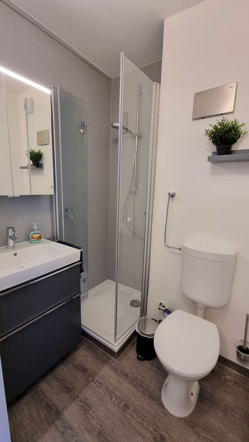 Eine moderne und hochwertige Glasduschkabine stehen im kleinen Badezimmer zur Verfügung - so auch ein Handtuchheizkörper sowie ein beleuchteter Spiegelschrank.