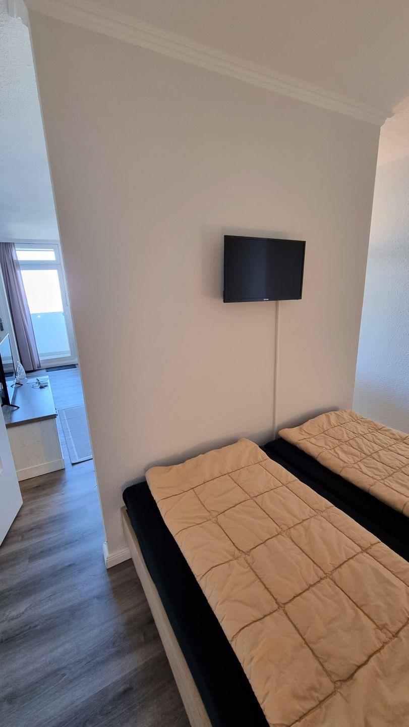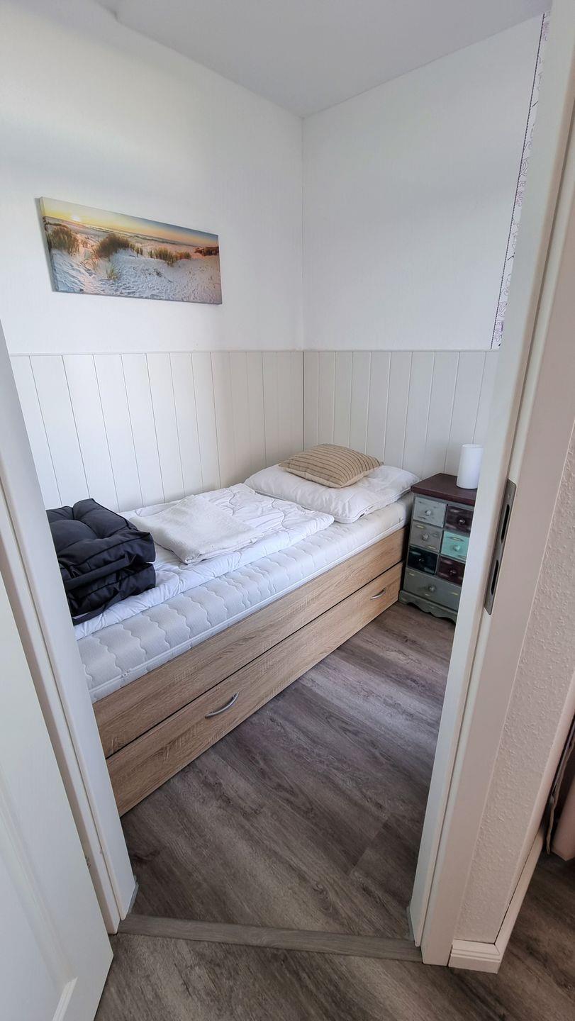 Das weitere, separate und kleine Zimmer verfügt über ein Einzelbett und eine sep. Heizung sowie eine Tür zum Balkon.