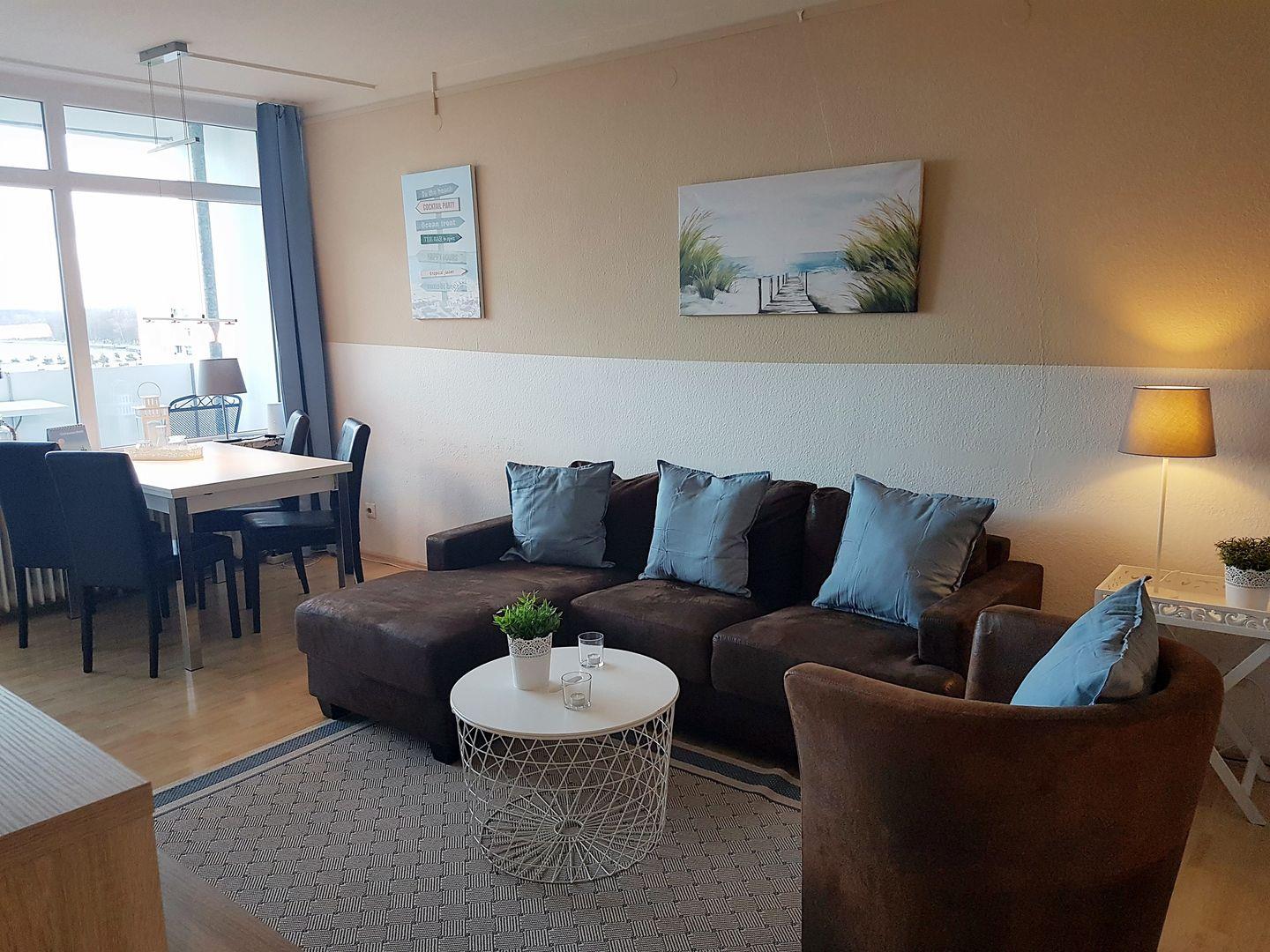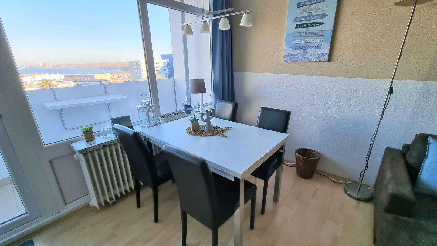 Freundliche Ferienwohnung in der 6. Etage mit Balkon zur Ostseite und herrlichem Blick auf Ostsee und Binnensee.