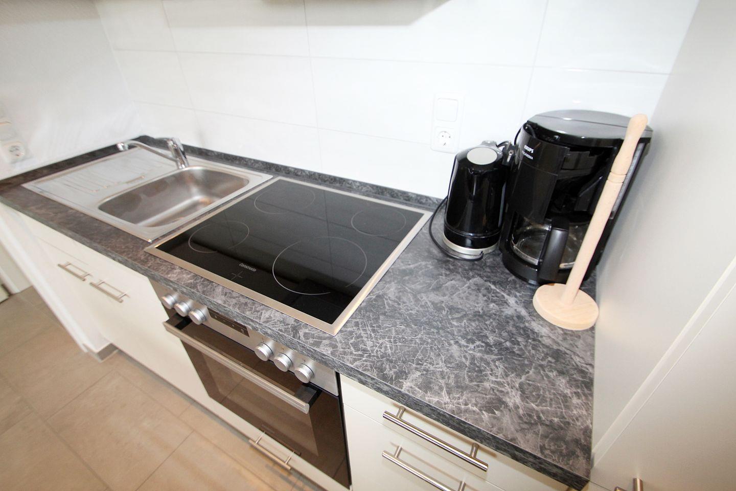 Die Küche verfügt über Backofen, 4-Plattenherd und Kaffeemaschine, Toaster und Wasserkocher.