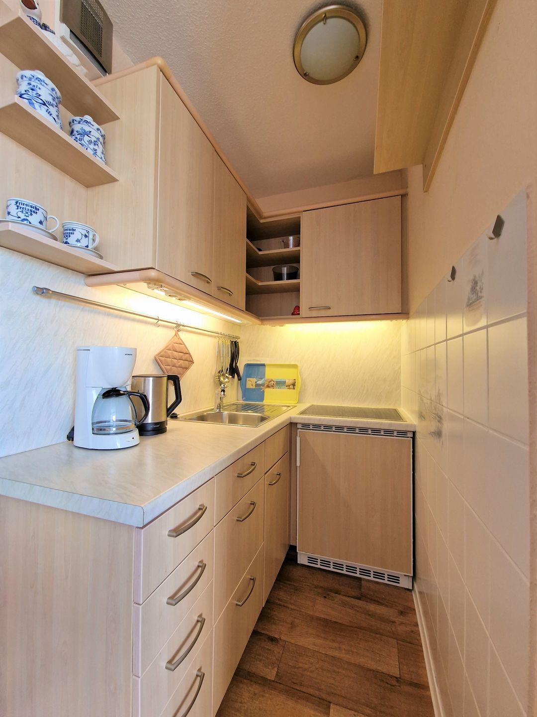 Küche mit 4er-Ceranfeld, Mikrowelle,Grill und Kühlschrank mit Gefrierfach.