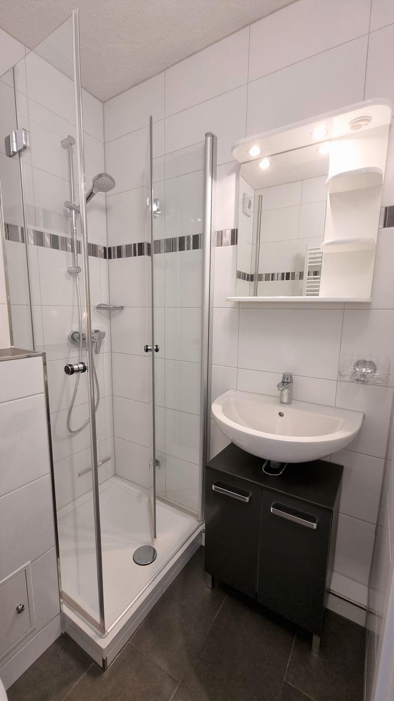 Ihnen steht ein schickes, modernes Bad mit einem WC und Dusche (Duschkabine, flacher Einstieg) zur Verfügung.